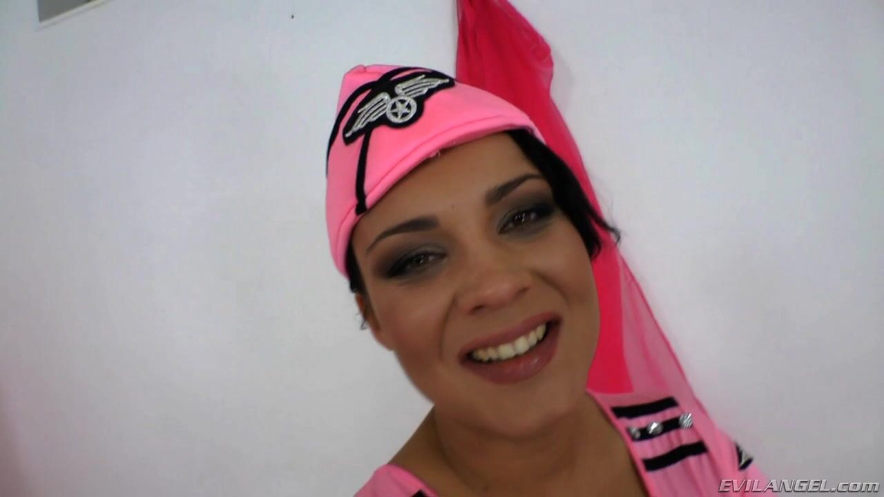 Buxom, tanned temptress Piksi wears a sexy pink mini-stewardess outfit that shows off her cleavage - she must fly the friendliest skies. Piksi likes some B&D with her butt-fucking, so hugely hung Italian porn pervert Omar Galanti affixes clothespins to her mouth, tits and pussy lips. She returns the favor, putting the clips on his scrotum and prick! With her legs cranked up on his shoulders, she takes a serious fuck. Omar cock-reams her asshole and cock-slaps her face; her butthole gapes and she sucks cock A2M-style before being showered with sperm.