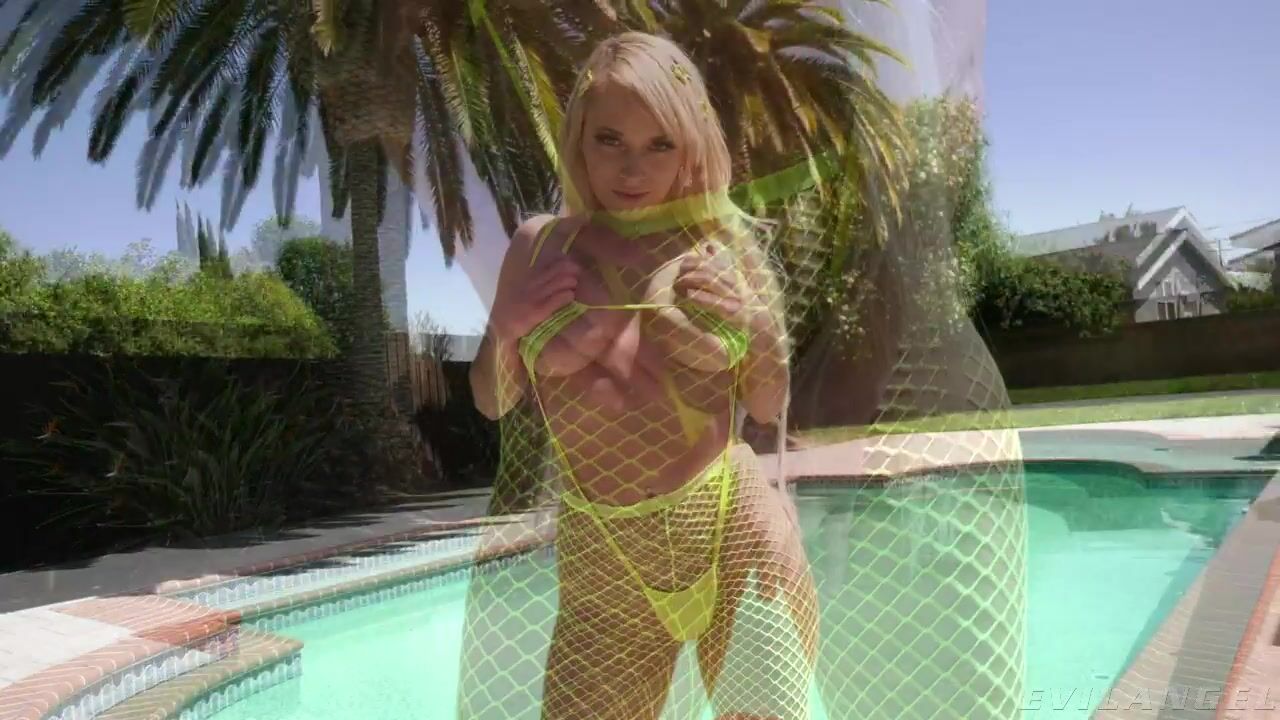Blonde dynamo Ava Sinclaire teases in a poolside setting, bouncing her plump, natural titties and peeling bright yellow fishnet stockings from her bountiful butt to jiggle and twerk for the camera. She excitedly chows down on muscular stud John Strong's stiff prick, greedy to lick his balls and rim his asshole. He peels off her hosiery to pummel her pussy doggie-style. Her round rear rotates on his cock as they moan with delight. John next dribbles lube onto Ava's sphincter and then plows inside, soon withdrawing for an ass-to-mouth blowjob. He delivers an anal reaming in spoon position amid Ava's passionate pleas to fuck her to orgasm. Her boobs bob through a buttfucking ride as she gasps and grinds on his boner. Ava's red asshole gapes! She rims John and then mounts his meat for more hard rectal reaming. Pretty Ava kneels for a hot cum facial.