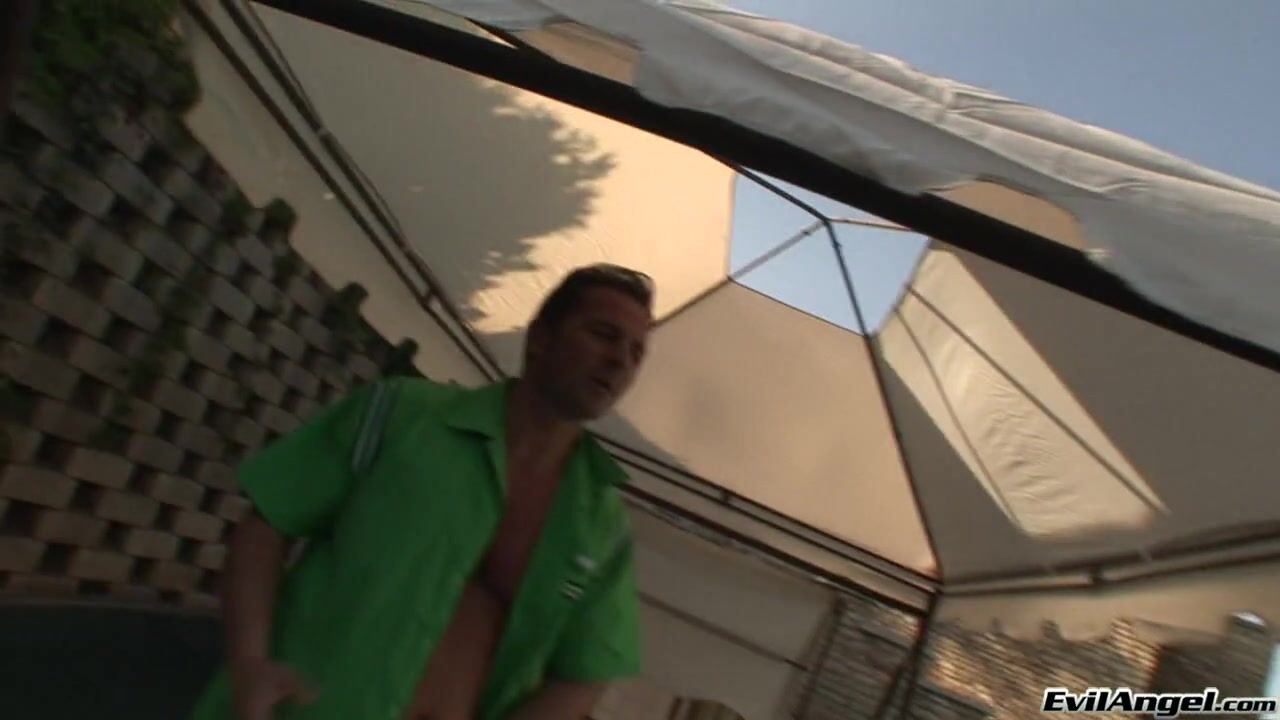 Brunette Kyra Black looks ready to devour as she poses in Christoph's back yard in her bathing suit and naked. She puts the bathing suit back on and sashays over to the pool, where David Perry is already jerking off, 'I'm just the gardner, but ... please, please let me touch you!' Proving to be a very accommodating young whore, the dusky beauty immediately leans forward and starts sucking Perry's cock, and doesn't even mind when he grabs the back of her head and makes her a gag a few times as he fucks her face. In reward, she gets put into doggie so David can slurp her ass, and after some more head a full-out fuck scene erupts out on the patio by poolside. Kyra takes a good railing in her pussy before laying on her back so Perry can fuck her tits like a crazed monkey, as she offers some very sexy sideways glances. He pounds her side-saddle and then makes her 'walk like a dog on the floor.' Kyra looks amazing crawling around the rim of the pool and over to the chayse lounge where Perry lays waiting the coup de grace - some rimming, followed by a steamy cowgirl anal ride!