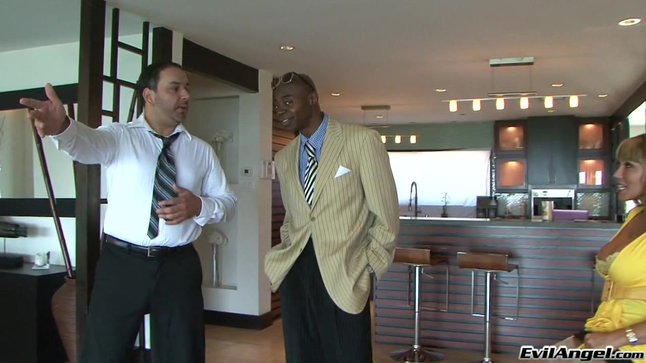 Married Ava Devine and Johnny Fender are joining a swingers' community in Las Vegas as soon as they can sell their house. Would-be buyer Sean Michaels needs an incentive to close the deal, so Ava offers a hot interracial fuck. She's delighted as she pulls his big black cock from his pants, and Johnny says, 'You hit the jackpot, baby,' as he strokes his dick. Shameless Ava deep-throats and rims Sean as Johnny tongues his cheating wife's asshole and finger-fucks her pussy. She sucks Johnny while stroking Sean. The stud butt-fucks Ava to howling; she sucks Johnny while Sean reams her anally. Sean and Johnny both cream her smiling face.