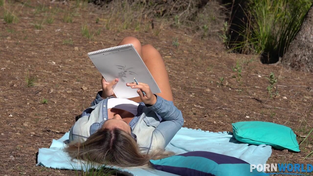 There was no better place for Briana to relax herself, so she decided to spend her day outdoors painting. This adorable green eye blonde was painting and enjoying in nature, but she decided to please herself a bit. She took of her bra and her panties, and started to masturbate. After a while, she heard some noise and ran into a lumberman. This curvy ass blonde was so horny, so she used lumberman to continue where she stopped. Lumberman was not only experienced with using his axe, it turned out to be experienced with his tongue and dick. He licked her trimmed pussy, made her wet and fucked her until he came on her huge tits. What a perfect day to have sex., 12/19/2020