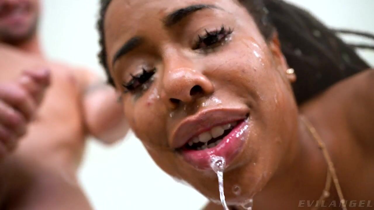 Stunning black beauty Kira Noir performs an epic, slow-motion striptease, slipping out of sexy lingerie. The athletic, cock-craving vixen shows off her fit body, masturbating and drooling. Kira feasts on the stiff pricks of studs Jay Smooth and Jason Moody. The dudes cram both dicks into her mouth at once! This interracial blowjob threesome serves up sloppy face fucking and intense, deepthroat fellatio. Lewd Kira rims bunghole too! She opens wide for two messy cum facials, and she thanks the guys.
