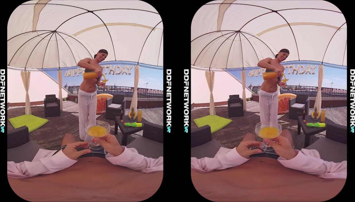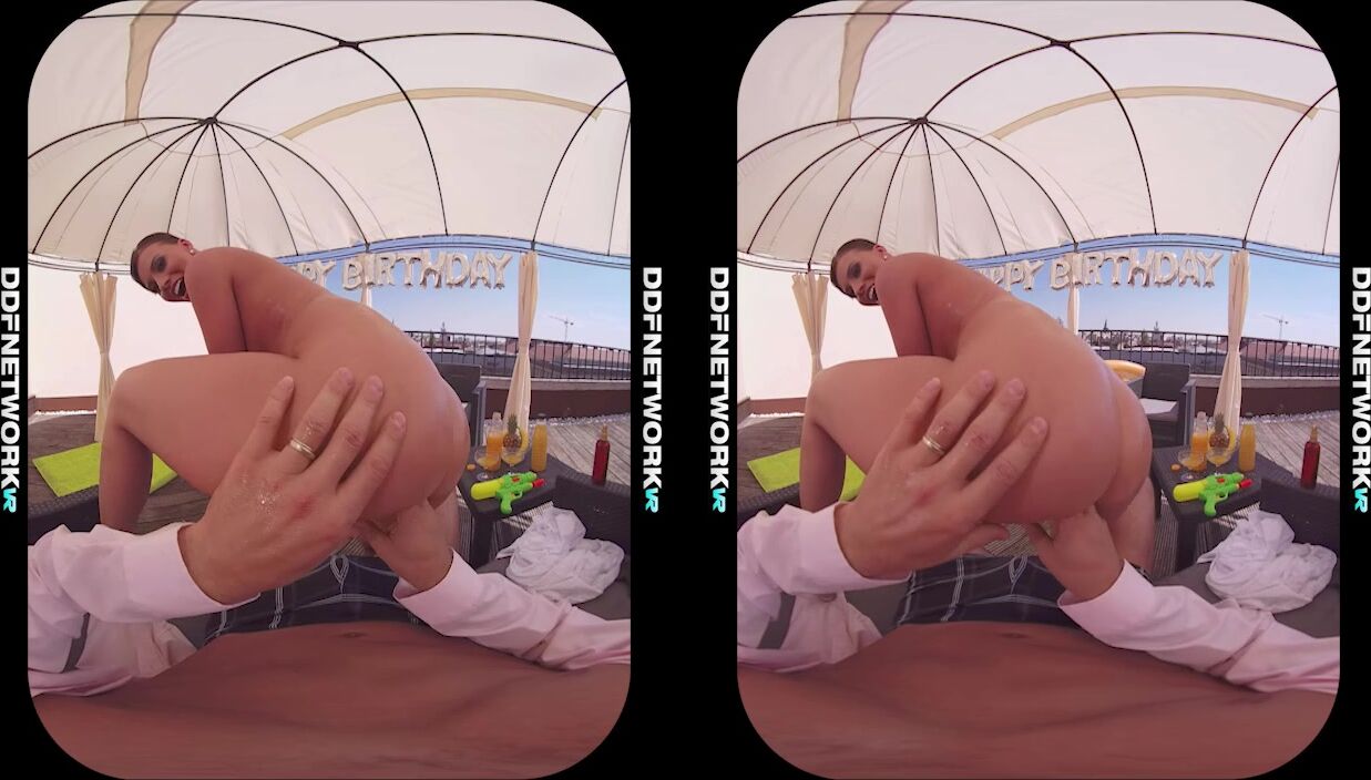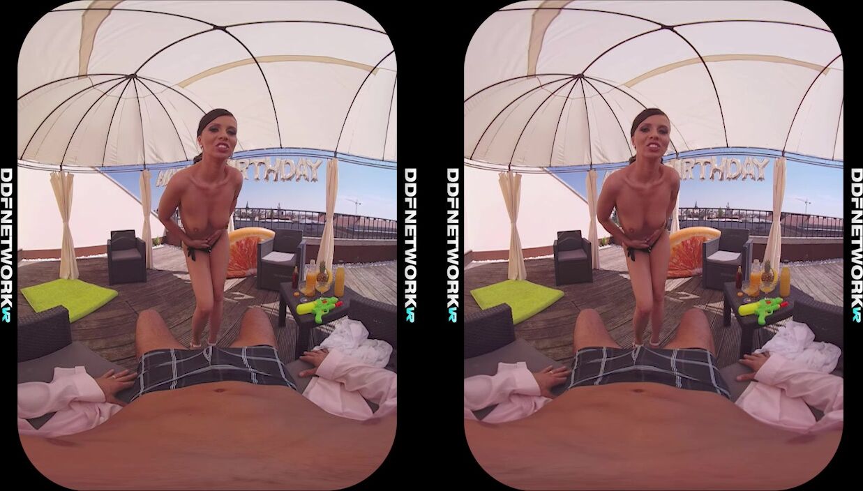 It's your birthday party today and you're celebrating with Hungarian hottie Vicky Love in a private rooftop cabana, courtesy of DDFNetwork VR. Watch this remastered premium virtual-reality porn video in 3D 5K 60fps and have an amazing immersive experience so close to real life that your dick will be stiff and jizzing in no time. Sit back and enjoy the POV striptease show that the nymph Milf does for your eyes only, followed by an epic deepthroat blowjob. Then off comes her sexy bikini so that you can spray oil every bit of her banging 4A-25-36 fit-to-fuck athletic body, including her natural tits for titty fucking and her trimmed pussy for fingering and pussy fucking. Let the black-haired beauty ride your cock in reverse cowgirl to orgasm, pound her in missionary till sunset, or at least hardcore fuck her until you bust your load deep inside her pink. Then watch your cum ooze out of her pussy gape for extra measure. You're going to wish it could be your birthday everyday, so get your VR gear now and get ready for the party of your life., 01/29/2019