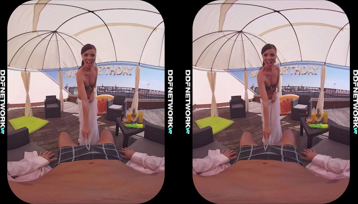 Description: It's your birthday party today and you're celebrating with Hungarian hottie Vicky Love in a private rooftop cabana, courtesy of DDFNetwork VR. Watch this remastered premium virtual-reality porn video in 3D 5K 60fps and have an amazing immersive experience so close to real life that your dick will be stiff and jizzing in no time. Sit back and enjoy the POV striptease show that the nymph Milf does for your eyes only, followed by an epic deepthroat blowjob. Then off comes her sexy bikini so that you can spray oil every bit of her banging 4A-25-36 fit-to-fuck athletic body, including her natural tits for titty fucking and her trimmed pussy for fingering and pussy fucking. Let the black-haired beauty ride your cock in reverse cowgirl to orgasm, pound her in missionary till sunset, or at least hardcore fuck her until you bust your load deep inside her pink. Then watch your cum ooze out of her pussy gape for extra measure. You're going to wish it could be your birthday everyday, so get your VR gear now and get ready for the party of your life., 01/29/2019