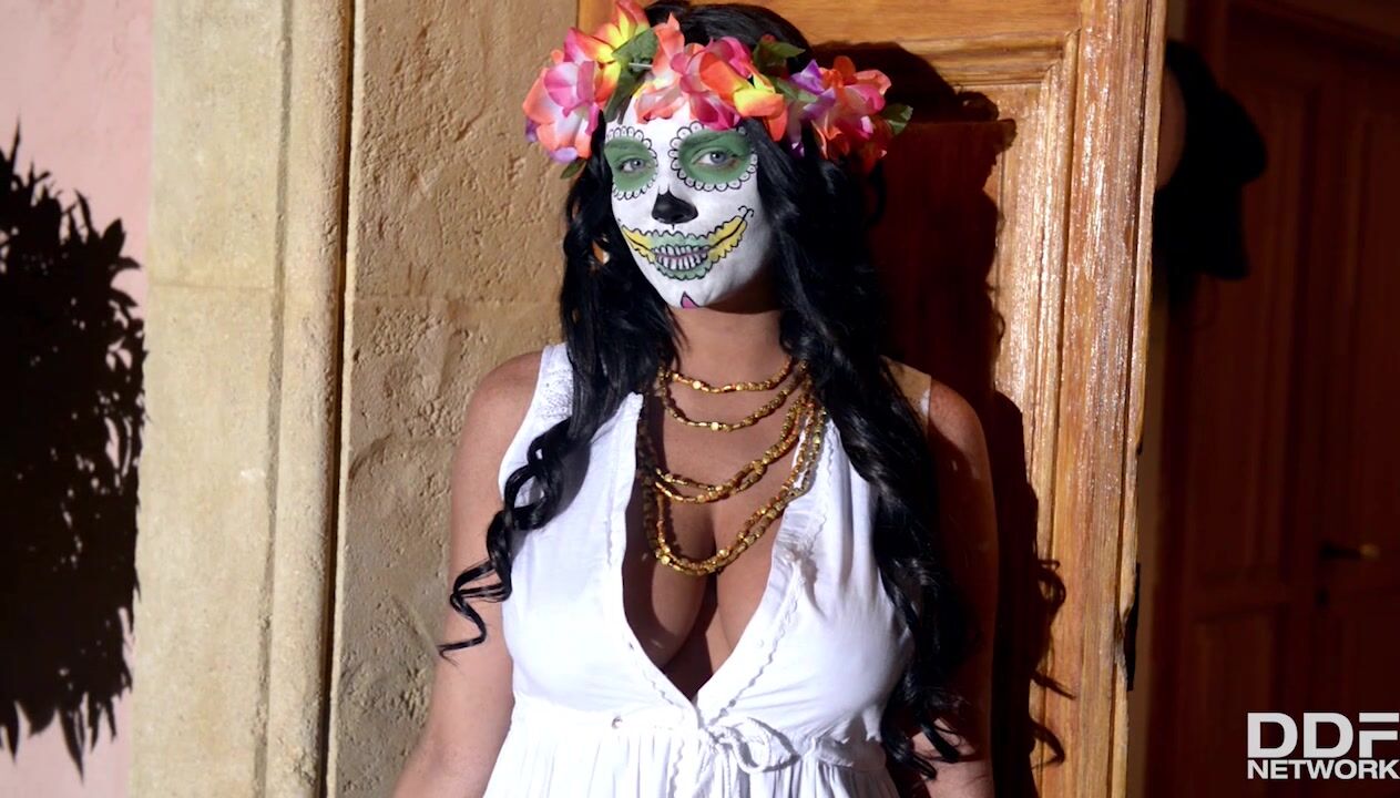 Emma Leigh aka Emma is one of the prettiest girls on our site. Thats why you should prepare yourself to be shocked out of your tighty-whities when you see her Halloween appearance today. Yes, this spooky gal is Emma from Great Britain! The young lady famous for her freckled, busty, ebullient aura is here in the wildest disguise possible to give you chills and gasps as you gaze upon her ultra-creepy midnight persona! Those fantastic 34DDD/E knockers prove that its Emma, and those amazing blue eyes too. Judging by the garland of flowers in her hair, she seems to be some kind of supernatural creature, a succubus perhaps whos wandered in from the dark woods outside the house, and on whose stairway she poses to lure men to their dooms! Come close, honey! she seems to say in her pics and video, make love to me, sugar, muah-ha-ha-ha-ha-ha! Happy Horror-ween!! Muah-ha-ha-ha-ha-ha-ha-ha-ha!!!!!!, 10/30/2014
