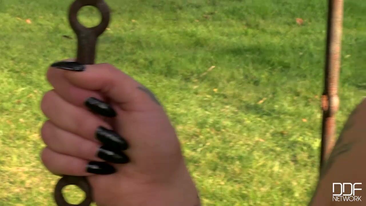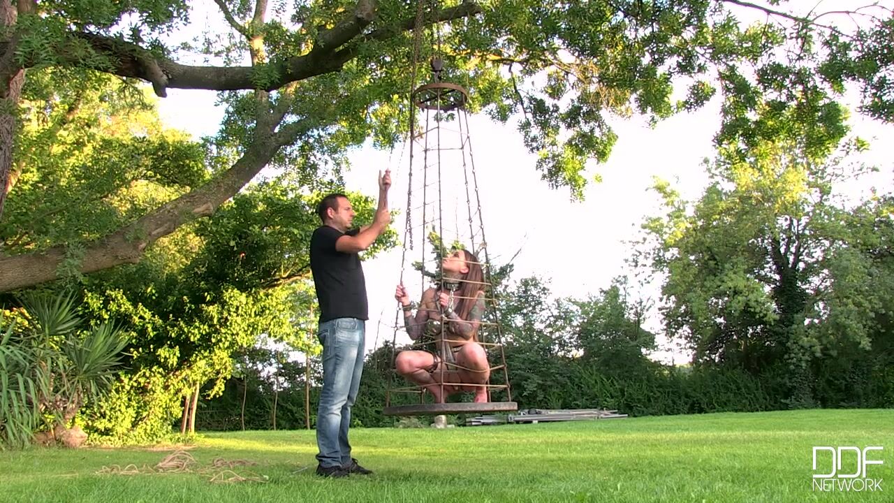 In todays roleplay, Lauren is under the control of JB, who leads the tattooed beauty around on a leash in a garden and drags her over to a tree stump, against which she kneels for the application of discipline with a riding crop. What are her crimes requiring this punishment? We leave them to your imagination... Bound on her thighs and wrists with chained and metal restraints, the stunner from Great Britain is at the mercy of her master. She tries to resist but he drags her to a strange device hanging from a tree. It turns out to be a kind of rope cage! Once shes secure in the cage, its hauled up from the ground so she will be displayed like a zoo animal in the waning sunlight. What would you do if you came across this girl in a cage? Youll have plenty of time to decide as you view her Full HD BDSM fetish XXX video!, 10/13/2014