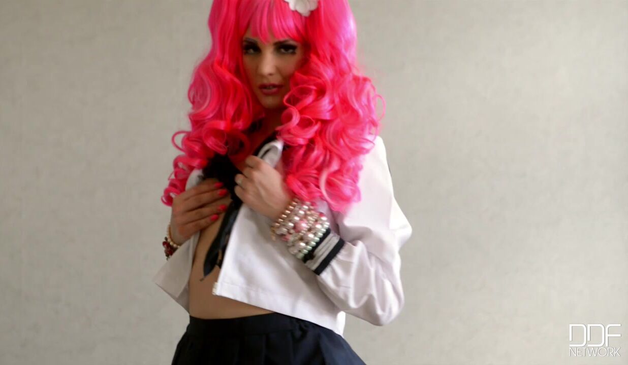 Girls who get into costume play (or cosplay) can be as playful and inventive as their clothing. Like Candy Sweet from Hungary, who appears with colorful bracelets, sailor-styled top, double-ponytailed wig, black pleated skirt, and ankle strap platforms with frilly socks. Greeting us, she drinks a blue liquid, unidentified but probably as sweet as Candy herself! Full of even more surprises, she lifts her skirt to show off navy blue underpants with white hearts and a delicate bow on the waistband. Yep, this is total cosplay fun! After she tugs aside her scanties and blouse to unveil all her pretty parts, Candy has another surprise. You wouldnt expect a cosplay girl to have a plain ole toy for her vajayjay, now would you? Watch her reveal a special unit in disguise, and then ogle as she puts it to use, in her explicit pics and Full HD video, 06/11/2014