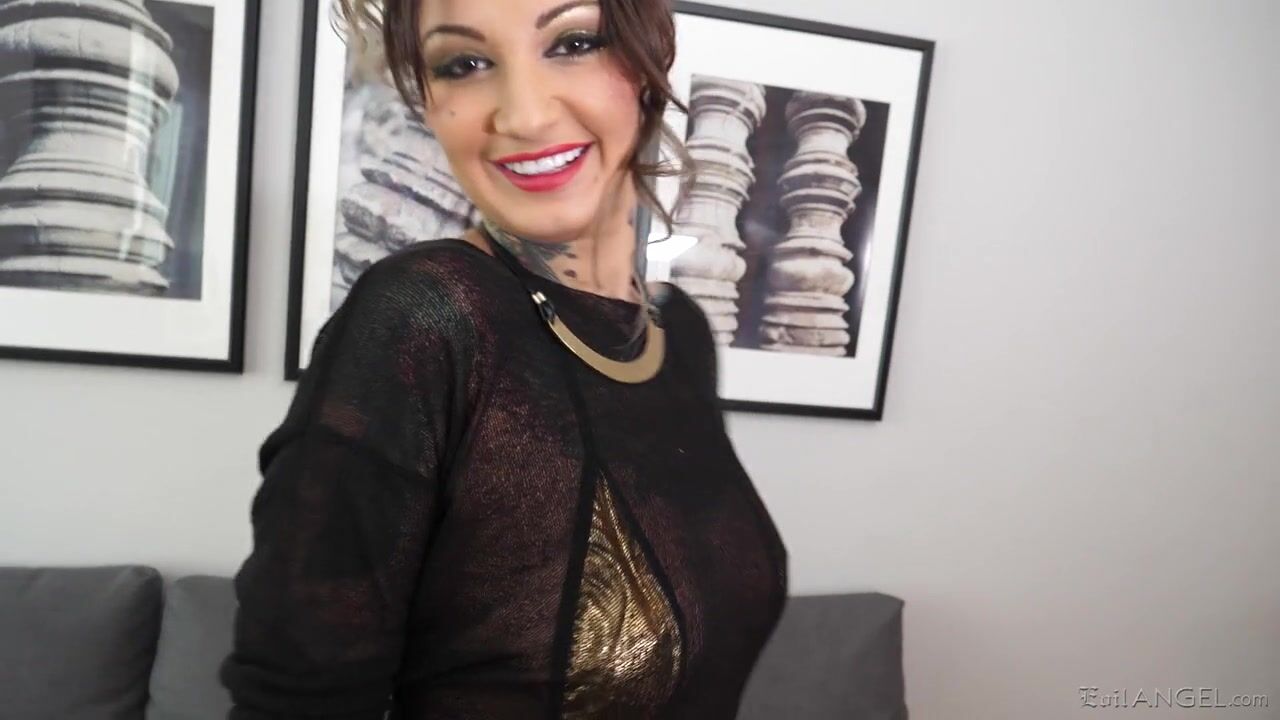Tan, tattooed Adel Asanty wears a slinky gold bikini, eager for an intense interracial threesome with Angelo Godshack and Dylan Brown. Adel probes her sphincter with a toy, soon welcoming the boys with passionate kisses. One stud porks Adel from behind as the other fucks her throat. Savage double penetration comes with a crude, ass-to-mouth blowjob and harsh choking. Adel's asshole gapes from nasty anal reaming, and she gives a tasty rim job. The insatiable brunette opens her lips for a splattering cum facial from Angelo's white meat. Adel scoops up the sperm from Dylan's big black cock and swallows it!