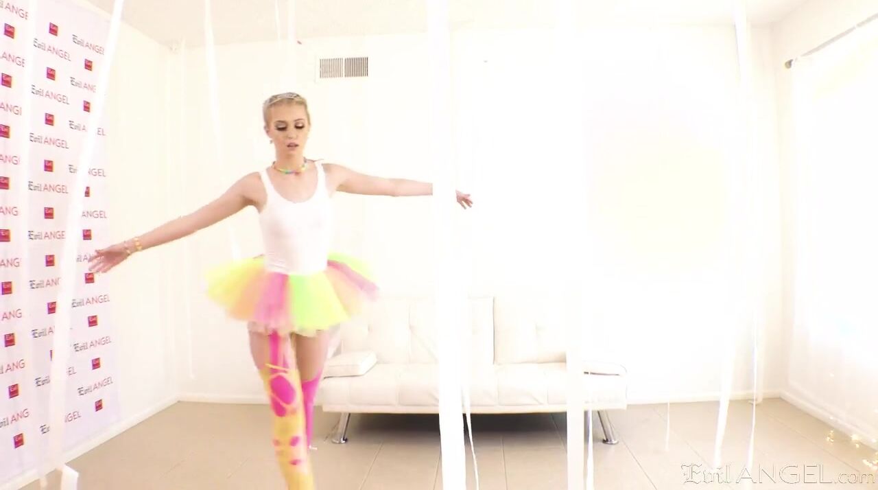 Blonde ballerina Chloe Cherry dances around the room, her pale, soft bubble butt visible under her taffeta skirt. She fucks her tender asshole using a big candy lollipop until she orgasms under a colorful shower of confetti! Chloe gives dance partner Chris Cock an interracial blowjob, worshiping his big black cock. The slender, all-natural white girl gags on his ebony meat. She crouches on all fours for an intense pussy pounding. Chris delivers an anal reaming, and he fucks her face ass-to-mouth. Butthole gaping, she enjoys a messy cum facial.