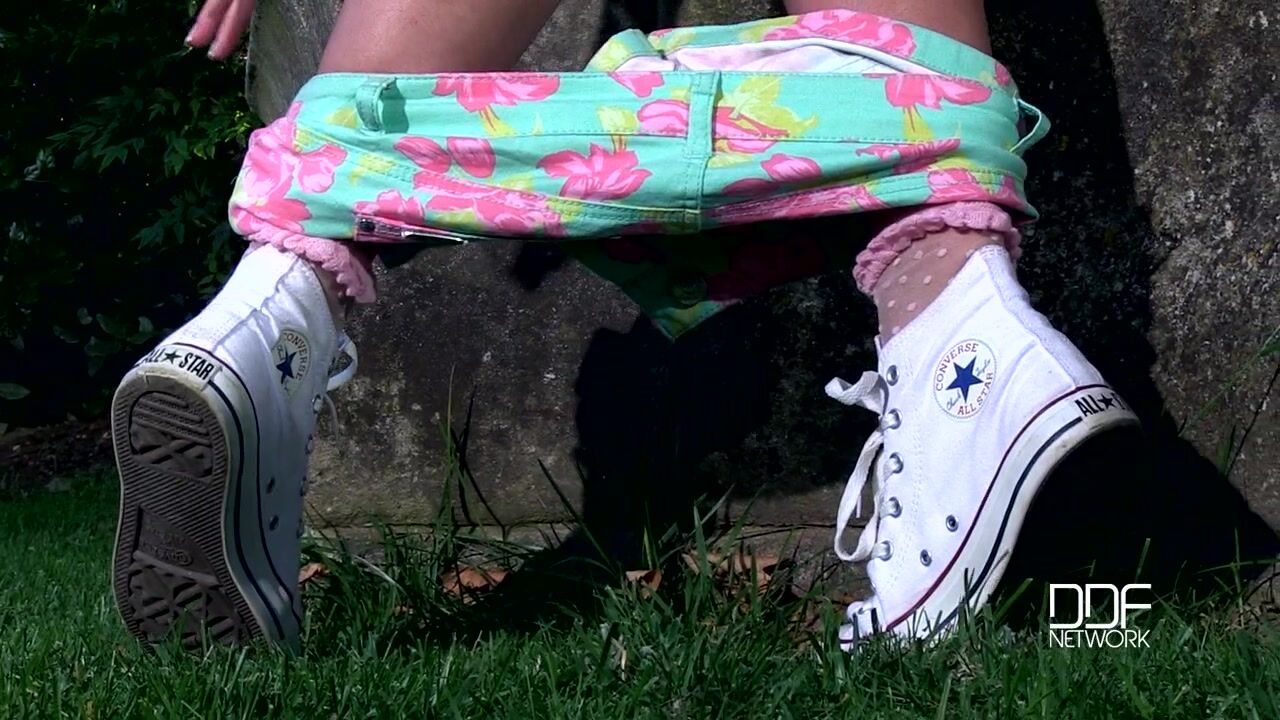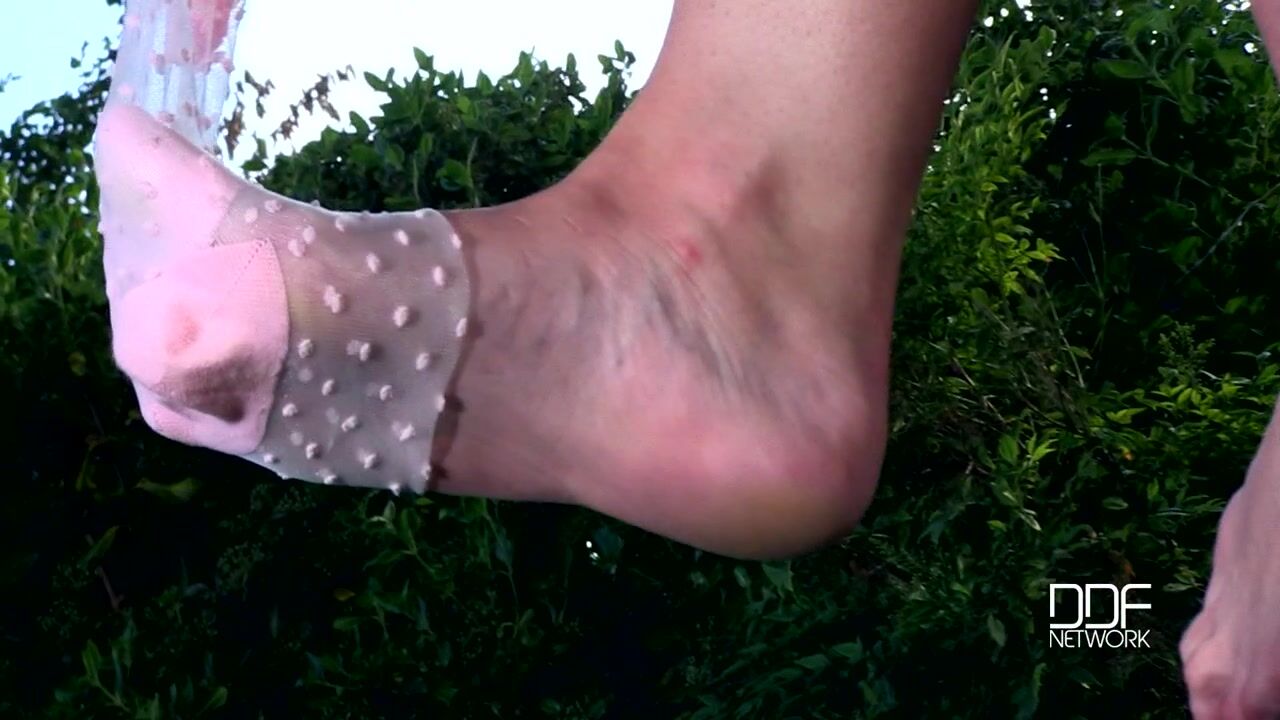 Lexi Lowe is back today, and this time shes outdoors and ready to tease us in her halter top, colorful shorts, white high-top sneakers, and frilly lace ankle socks. What a combination!! As she peels down her shorts she gives us a gander at those grand glutes, then after she flashes her quim she shifts her concern to her size 8.5 feet. Off come her shoes and she takes a deep whiff of their aroma, then she poses in her socks, regaling us with the rich color of her toenails underneath the fabric. This United Kingdom darling gives us some great pinup-style leg poses, as she stretches out those stems. She peels off her socks one by one and plays with them, wearing one like a glove and rubbing it against her pie. Lexi flexes her feetsies and wiggles her toes as our DDF cameras come in close to grab shots of her soles and toes from underneath. Get ready to spurt for this expert tantalizer as she finally stands on her bare tiptoes at the end of her Full HD video!, 03/19/2014