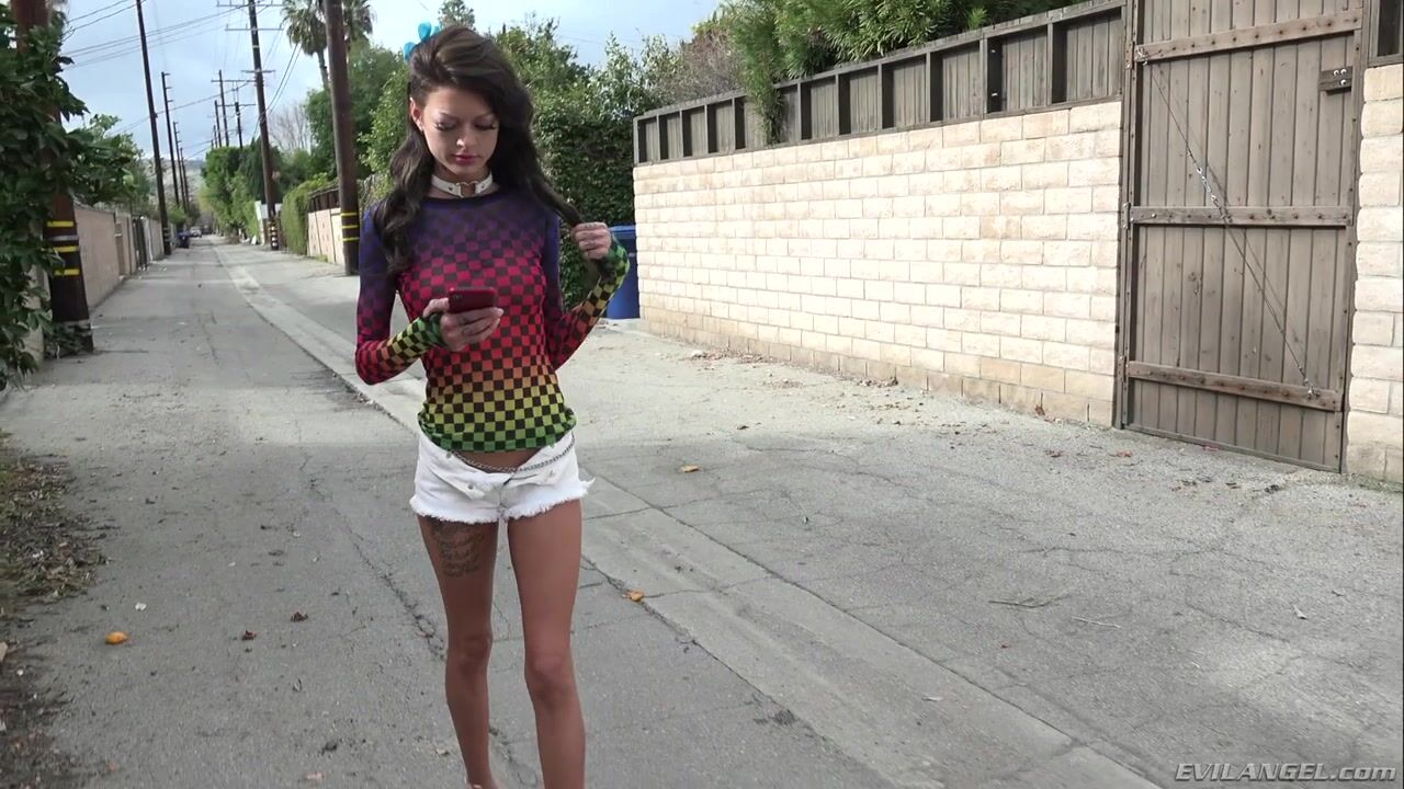 Kimber Veils shows off her cute ass and toned, tattooed body on stud Bryan Gozzling's doorstep. She spreads her pussy lips, smiles and shows how dirty she can be. Bryan eats her pink cunt, and she squats to give him a sloppy blowjob. Bryan's prick penetrates Kimber's bald twat, making her moan. He grabs her by the hair for an aggressive throat fucking. Kimber turns around and perks her ass out for Bryan to eat it in a raunchy rim job. Doggie-style pussy pummeling comes complete with a hot cum facial.