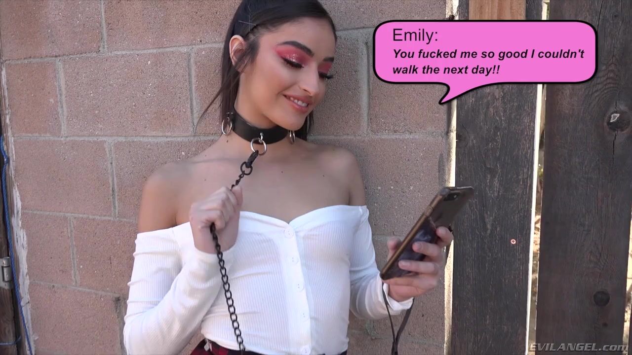 Wearing a plaid skirt and a leash around her neck, dark-eyed cutie Emily Willis gets excited sexting with heavily hung Bryan Gozzling. She submits to the dominant stud, smiling as Bryan wraps his fingers around her neck. Emily rolls up her panties and gasps as he aggressively finger-fucks her tight teen cunt. She kneels, gagging as she deep-throats Bryan's fat dick. And then Emily bends over on the couch for a hard anal pounding. Awesome buttfucking comes with playful butthole gaping, an amazing ass-to-mouth blowjob and a creamy cum facial.