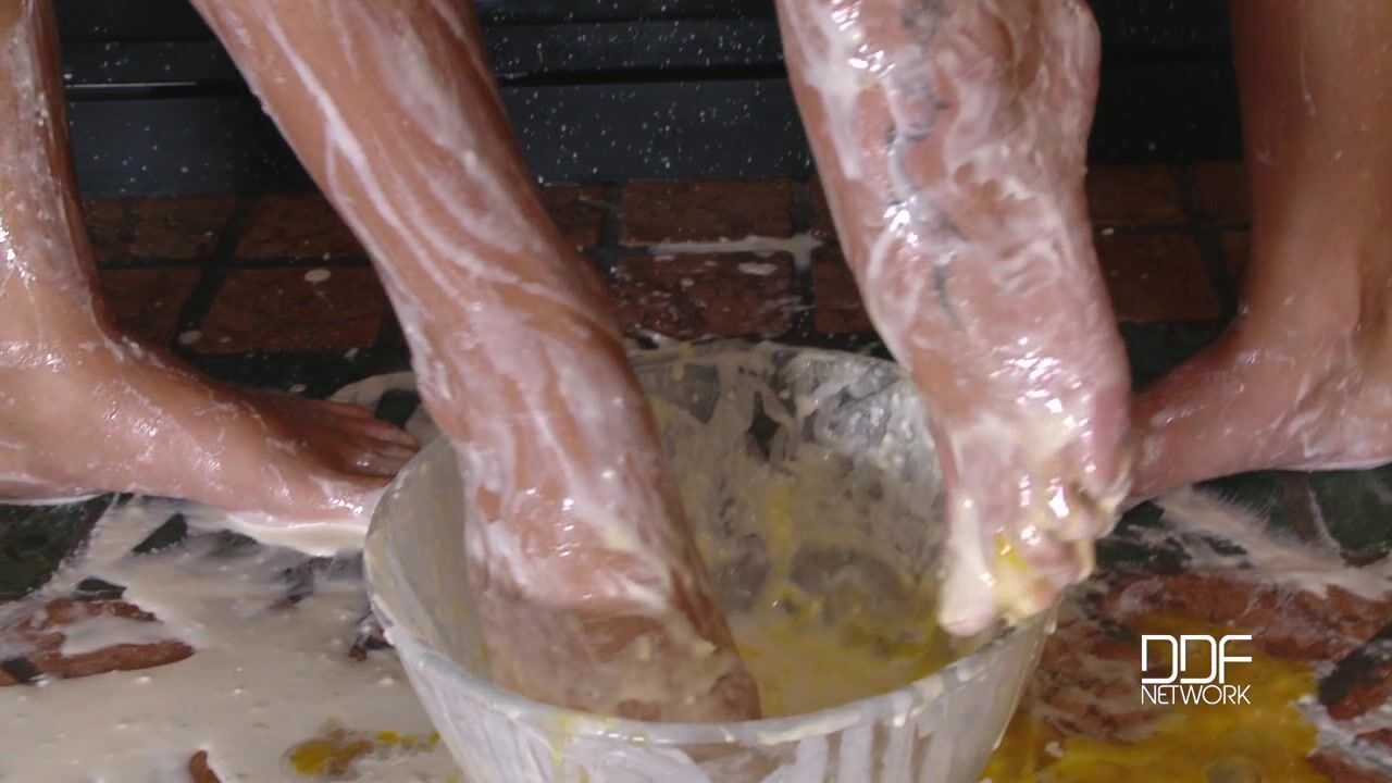 In the old days of rampant sexism before the feminist revolution, it used to be said that a womans place is in the kitchen, but based on the evidence of the hijinks Mia Manarote and Gina Devine are up to, youd think women should be kept OUT of the kitchen altogether because they make more of a mess in there than the Three Stooges would! Our Czech gals start out with good intentions with the makings of a cake, but soon milk and wet flour are spilling down their bare legs and onto their feet in their flip-flops and sandals. Unlike Larry, Curly and Moe causing chaos in a kitchen, however, Mia and Gina start licking each others bare tootsies and showing them off to the camera. Nyuk, nyuk, nyuk! youll chortle like Curly used to, as you take out your cock to watch Mia rub batter all over Ginas toes, before both gals stick their feet in the gooey bowl and then offer their wrinkled and messy soles to us for our contemplation and climax! Gina especially looks like she enjoys sucking on Mia's size 6.5 digits, especially the big toes, and Mia herself seems happy indeed lapping the batter off Gina's insteps. But the fun is only halfway over as they continue to suck the batter off their peds as well as getting in some fingering and kissing as well. Soon eggs are broken and yolk is stepped in and then their soles are presented to us for ultimate cleanup!, 02/25/2013