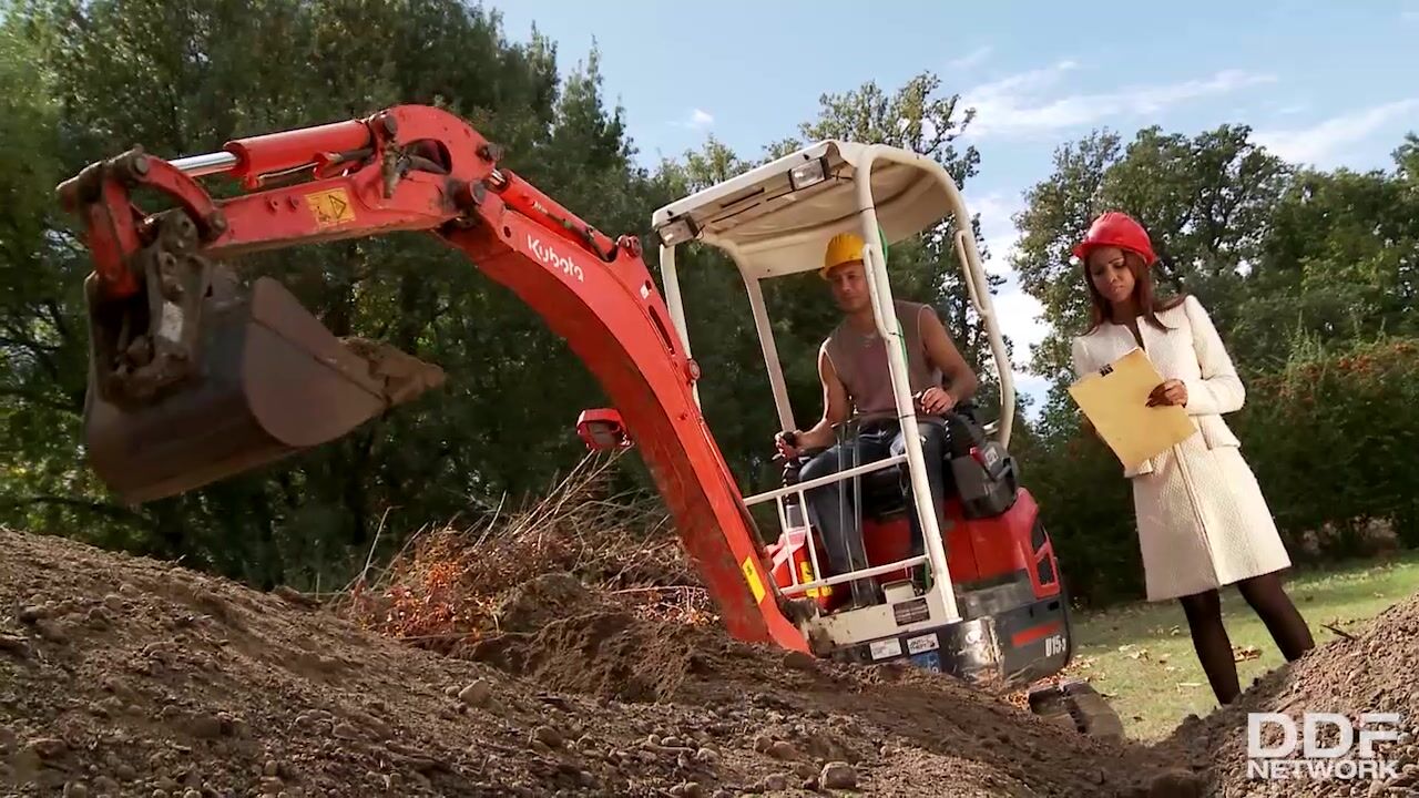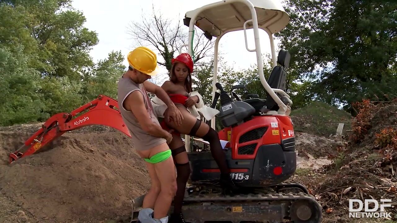 Shapely Katia Dé Lys is a supervisor on a construction site, but underneath her coat shes dressed more for performing in a live sex show in her red lingerie, thigh high sheer black stockings, and black high-heeled booties! Although she starts out doing her job normally and asking the required questions, once she meets the studly foreman Kdube as he sits on his Caterpillar, shes a goner. Yet the hardhats stay on even as she takes his huge cock out of his jeans and starts to suck. The dick fills her mouth and she lathes it with her tongue as she squats down in front of him, her coat falling open to reveal that sensuous underwear. Kdube licks her pussy in turn, fingers it, and then slides his meat into her from behind. Getting comfortable on the Caterpillar, she sits down on his meat and rides it reverse cowgirl style, then turns around and faces him as she moves up and down on his shaft. Katia really has an amazing ass, and Kdube finally tugs her panties off completely so that he can play with it. He lays down on the ground and Katia straddles his dick, so that we get to watch her ass moving on his meat. The hardhats finally do come off as the action gets more fast and furious as she takes his inches into her bottom, then sucks him some more afterward. Sticking her booty toward our faces, she keeps blowing the foreman until he finally wants to take her butt once more. They stand up and lean on the Caterpillar and we see his gigantic shaft stretching her asshole, until finally she kneels once more in front of his prick and happily takes his load all over her tongue!, 10/17/2012