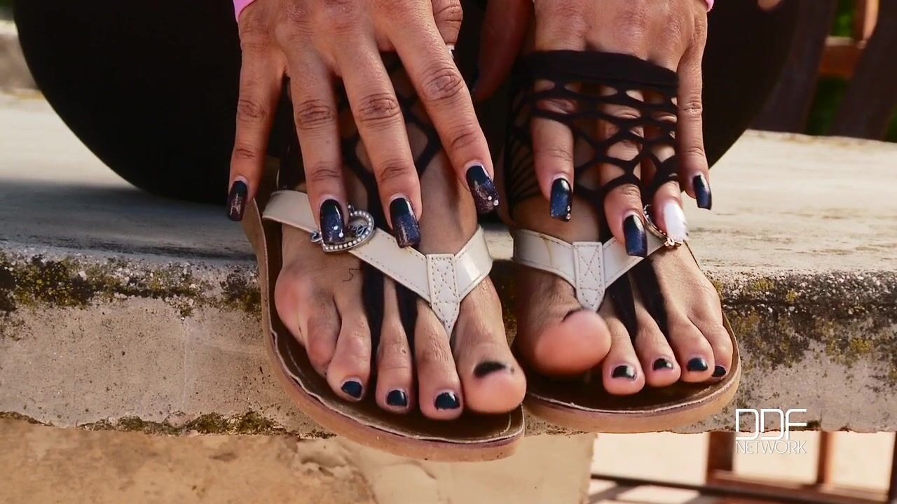 Today Czech blonde beauty Ashley Bulgari teases us with her size 8.5 feet on. Outfitted in a pink fishnet top, black cut-out leggings, and thong sandals with unusual black mesh socks that are purely ornamental and show off her black-polished toenails, Ashley sits outdoors on a stone table, displaying her gams and toes as she looks at us with a goddess-like detachment. Our DDF cameras hover around her feet, capturing them from many angles so that you can imagine licking her long toes and lapping at her heels. Slipping down her leggings, she reveals her pussy even as she takes off her sandals and rests her feet, still in those exotic socks, on the stone surface of the table.Ashley wiggles her toes at us, resting them on the back of a chair, and they're ready to be kissed and adored by any faithful slave. Then she squats on the table and sticks her ass up, giving us that kiss my bottom! look. She curls her peds so that her soles get wrinkly, and then she squats on the table and spreads her snatch in front of us, as if demanding cunny licking in return for the pleasure of our even looking at her feet. She lifts up her legs like a pervy pinup girl, then lowers them to the ground and leans on the gravel with her tiptoes. Youll almost hear the crunch of the gravel under your own knees as you imagine lowering your face to her feet and groveling for worship!!, 10/17/2012