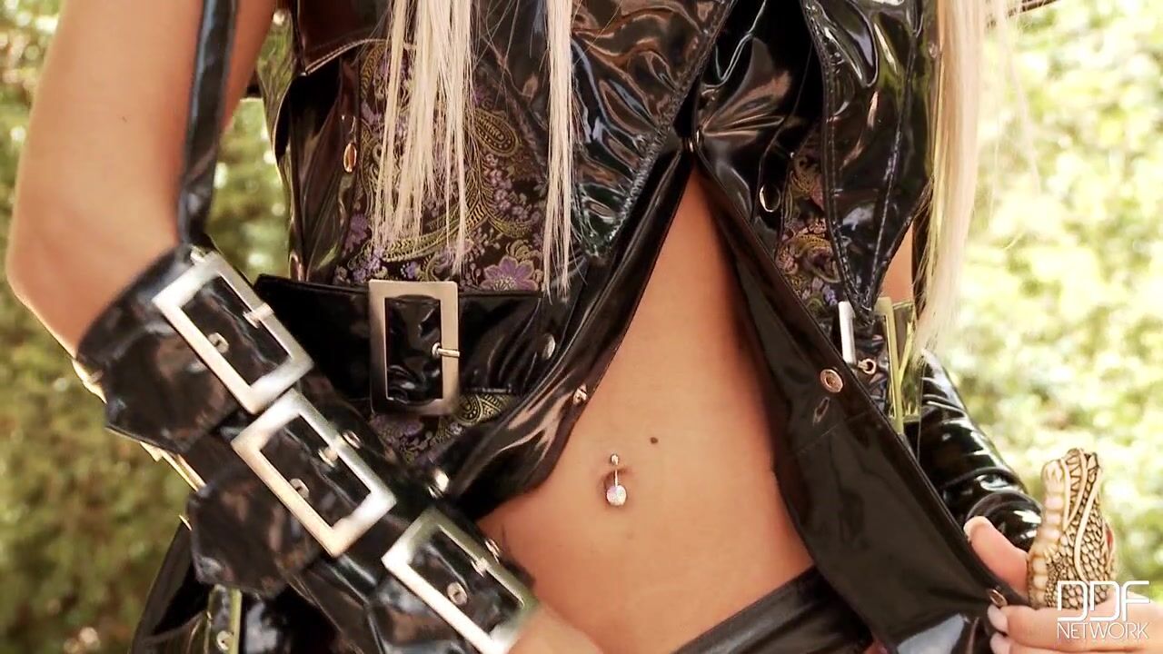 Too bad the great wandering samurai Sanjuro, played by Toshiro Mifune in the great 1962 Japanese movie of the same title, never crossed paths with Ashley Bulgari in her own warrior duds! Even the famously cool Sanjuro would have been hard-pressed to resist Ashley as she displays her deadly sword with its jeweled handle. But he might have been really flummoxed when she opens her coat to reveal her crotchless panties!Licking the shaft of her sword, she quickly settles down with the elaborately carved handle, licking it while she plays with her snatch. Even the wily Sanjuro would become befuddled at the sight of this blonde assassin as she crams the handle into her pink hole. Standing on a ledge, posing on her shiny black thigh high boots with her weapon at her side, she braces herself on a human skull--perhaps one of her victims who wasnt quick enough for her many skills? Sanjuro, be warned! Tangle with this roaming hottie, and try to make yourself her master, at your peril! Perhaps you could defeat her in a sword fight--but could you best her in bed?? Look at that asshole as she splays apart her cheeks! And observe how fearlessly she keeps banging herself with the hilt of her weapon! And are you ready to advance closer as she gets into the doggie position on the ledge, her butt up, her high heels kicked skyward, even as she licks on the sword handle? Is she inviting you for a session of love, Sanjuro--or to a duel, with a surprise move that could mean your last breath??, 07/02/2012