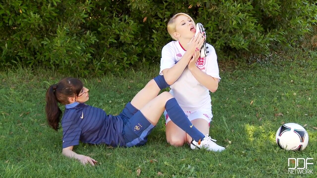 Posing in the uniforms of the teams of England and France are a couple of newcomers to our site brunette Samantha Bentley and blonde Tegan Jane helping us salute the UEFA Euro 2012 soccer championships now happening in Ukraine and Poland! They also manage to get themselves--as US!--horny in the process. Samantha wears the French uniform and Tegan the British as they briefly mix it up with the ball, but then quickly succumb to each others charms on the turf. Sultry Samantha (whos also a talented singer--read more about her on DDFBlog.com) leans back as Tegan passionately kisses her neck, and then the blonde unveils two mouthwatering breasts for Sam to suck. But the focus quickly shifts to legs and feet as Miss Bentley takes off Tegans shoes, sniffs them, and then rubs her peds in the white athletic socks. Tegan reciprocates, taking off Sams shoes and kissing her feet through the blue knee socks.Soon the socks come off for barefoot worship. Samantha licks Tegans hot pink polished toes and lathes her naked soles. Then she pulls of Tegans other sock and inhales deeply of the aromas, before leaning back in the grass and making love to the blondes foot while she takes her own foot and rubs it between Tegans titties. Tegan licks Samanthas feet too, and then the gals press their soles together and form an arch that an obedient little doggie could jump through! Would you like to be a doggie for these two soccer sweeties? We sure would!! Its only one of the fantasies you can enjoy when you check out their high resolution pix and full HD video. Soon they get their shorts off and are licking pussy while letting us admire their bare toes and asses in the grass., 06/25/2012