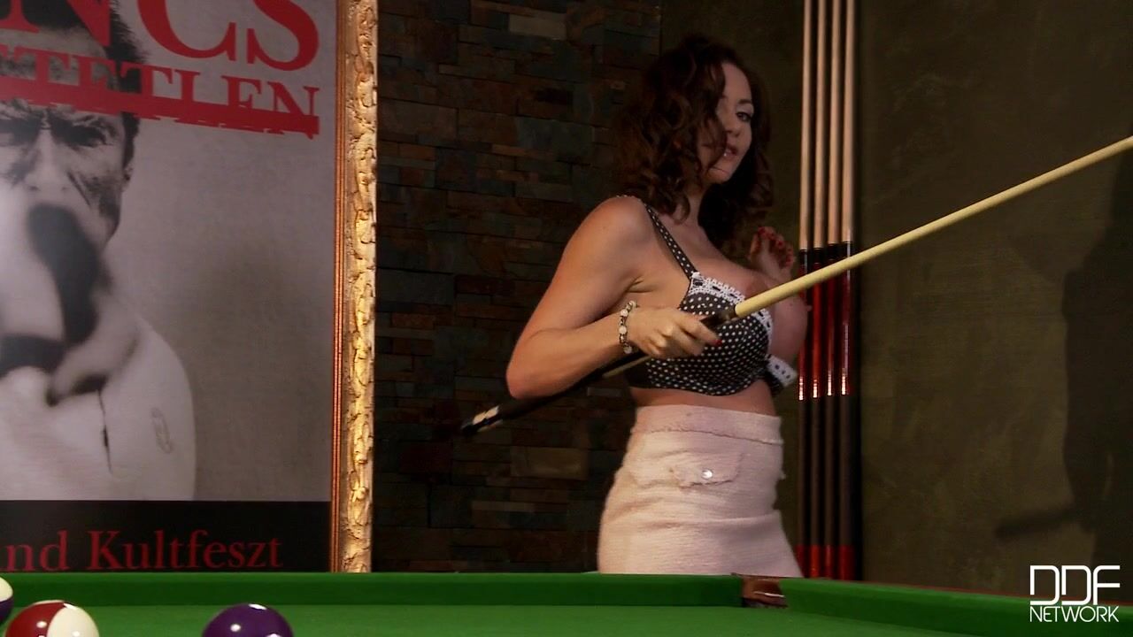 Enjoy a game of pool with Clanddi Jinkcego--if you can concentrate on anything other than her VERY distracting 34DDs! The French porn star is outfitted in a black-and-white boulder-holder, short beige skirt, and black stiletto thigh-high boots, so you know shes not only relying on her cue stick to win this game! She runs the stick between her cleavage as she sits on the edge of the table, and she leans over to give us a few down-the-valley glimpses of her bells--and soon enough shes rolling around on the green felt, showing off her knockers as they practically spill out of the cups, her nipples edging their way into the open air.Finally Clanddi tugs aside her bra and reveals the fullness of those mighty globes, then pulls away her panties so we can see the juicy pinkness between her strong, sexy thighs. Leaning back on the table and tugging her panties down to her stiletto heels, she then parts her lips so we can see into her hot little pink cave. Well, maybe not so little! It looks like Clanddi could take a long thick cock in there, deep and up to the balls! She plays with the stick some more, gives our DDF cameras some great ass shots as she bends over, then crams her twat with the handle of the cue. Some of the nicest pix come at the end, as she relaxes on her back with a sultry gaze on her face, her boobs just waiting for the arrival of our loads!!, 04/29/2012