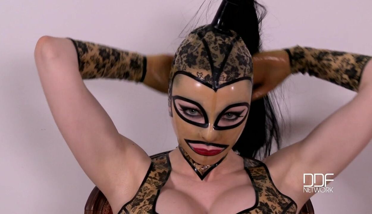 Latex Lucy is one of the most striking fetish models weve seen to date! With her colorful mask and waist-cinching garb, she immediately pulls us into a daydream world of submission to a haughty, ruthless mistress. Her waist cinched to an unholy size by her combination of corset and garter belt, she admires herself in a mirror as the cameras of Denys DeFrancesco and his crews mostly take a worshipful knee-high position on the floor, looking up at her commanding magnificence. Their lenses drink in every inch of her forbidding beauty, from the dangerously high heels of her strappy platform shoes to her green eyes and cruel lips peeking through the holes in her latex head mask. Lucys game is relentless tease of her minions! She knows we are helpless over our arousal at her curvaceous body as she takes down her corset and panties to bare to our drooling mouths and hungry eyes her pussy and asshole, delights that we will only dream of, never taste! She sits regally in her elegant chair and reveals her massive mams, knowing we yearn to suck them but will have to settle for staring!! Sliding her latex-gloved fingers into the flowery folds of her vagina, she then licks her hand to tantalize us with intimations of the tastes we can only imagine! She takes off her shoes and licks her heels and toes, making us even more fully aware of the delights we do not deserve to touch! We are meant only to kneel at her power and strength, this harsh but beautiful dominatrix who has invaded our dreams!, 01/04/2012
