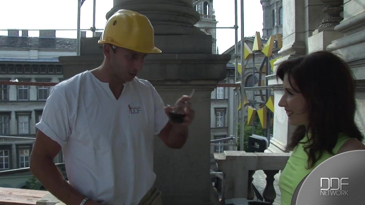 Here's a job benefit most people don't get! Lily Cross pays a visit to rooftop construction worker Nick Lang, bringing him a little refreshment in the form of a drink...AND her legs and feet! Soon enough she's distracting him with her gams in their thigh-high sheer black stockings and colorful backless wedgie mules. She rubs his cock between her foot and her shoe's sole, then jacks his meat with her stocking feet and teases the tip with her tongue. She's oblivious to whoever might be watching from the windows across the street.We see the wrinkles in Lily's soles underneath the nylons while she tugs at Nick's prick, and then she has him sniff her soles before resuming her footjob. Nick pulls off her stockings and then he fucks her feet doggie style. Then it's time for turnabout as Lily gets Nick down on the rooftop and masturbates his cock from above with her talented toes until finally Nick squirts his load up in the air. Then, as a final touch, Miss Cross slips her messy feet back into her mules, and we get to see them in closeup, her red toenails gleaming in the light., 11/11/2011