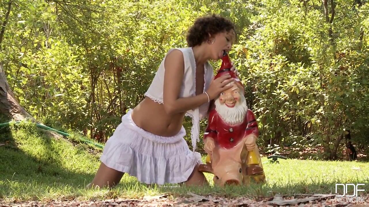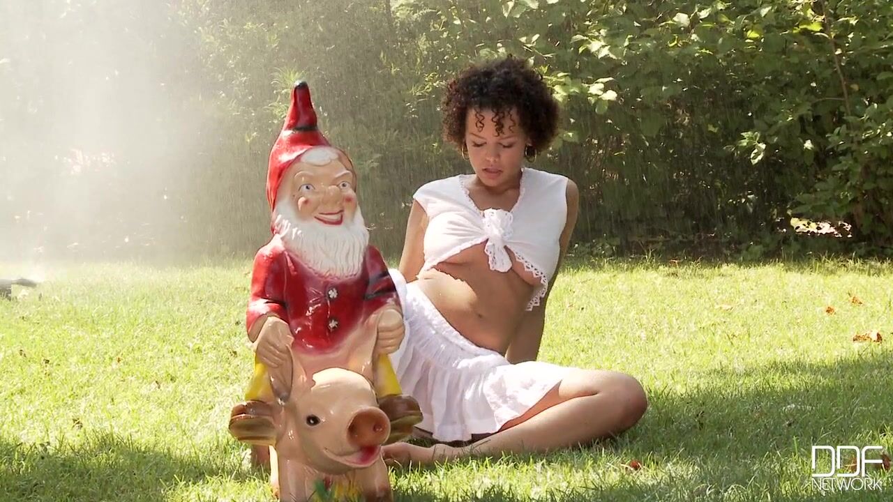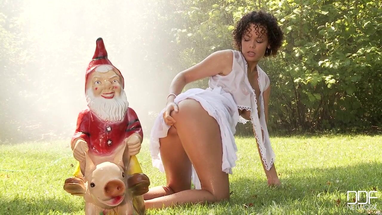 In the well-chosen words of a 1By-Day.com member with the username eadgbe, Linet has the most killingest body on the planet. I agree! There is something about this chicks naked 38C-24-33 figure that makes me wild too. Makes me wanna turn off my laptop and just stare at her and jerk off!! And suck her tits and lick her belly, if that were only possible!! Her face is so sexy, and has major glamour appeal. On Wednesday 8/17/11 she returns for her fifth appearance since last May, flirting on a lawn with the sculpted figure of a bearded, red-suited elf riding on a pig!! Lucky elf!!! She rubs the top of the elfs hat against her pussy and taint, then drives him nuts (although he looks pretty happy) as she kisses his cheek, spreads her clam in front of his porky steed, and then gives him and the piggie (and us, of course) a wonderful nude show, while the spray from a nearby sprinkler creates a magical aura around them all. Dont miss this amazing set, which earns Linet the honor of being Model of the Day., 08/16/2011