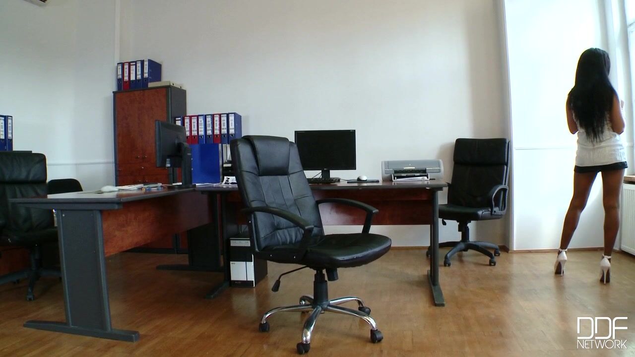 Newcomer Bettina di Capri shows off her fantastic legs in an office setting. She wears white ankle-strap peep toe pumps with a gold lace pattern that are very flattering to her gams, and she sits around filing her nails instead of doing any work. Her colleague Sabby finds her goofing off but with stems like hers, Bettina calls the shots. Soon she has him caressing her shoes and sucking the heels. Then she blows his dick while posing her butt and legs for us in her pantyhose. She gets Sabby to kiss her ass and pussy through the nylon. She jacks his prick with her spiky heels, then Sabby takes off one of her shoes so he can sniff it while she rubs her pantyhosed foot over his meat.Bettina is very limber, and while she rubs his prick with one foot, she twists her other leg around so she can lick her own nylon-covered toes. Then she goes back to sucking Sabby AND her own heels at the same time. This is one truly oral girl! And she encourages Sabby to be oral too, pulling aside her pantyhose crotch so he can lick her hairy pussy. She strokes his rod between her soles while he laps her, then she sits down on his boner while he sucks her perky nipples. In great closeups, we see how drenched her snatch is from his cock. Then they switch positions, lay across the table, and Bettina strokes his dick with her feet. Soon they're fucking again, though, and Sabby plows her doggie style on the table, tugging off her pantyhose so he can fuck her bare soles too. But Bettina gets the upper hand at the end, jacking his cock into one of her shoes, then licking the cream out of the peep toe and letting it slide over her nipples. A nasty foot and leg star is born!, 08/05/2011