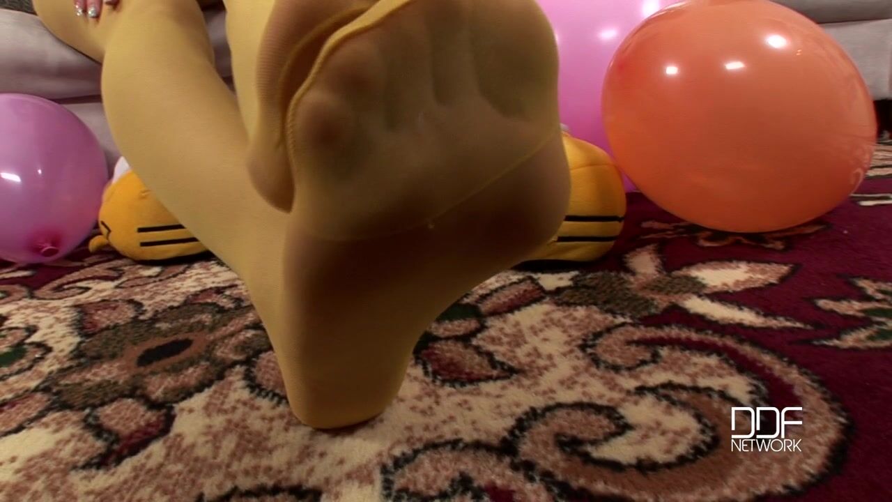 Friendly new face Claudia shows off her delectable feet in a solo pictorial and video in which she wears cartoon character slippers and plays with balloons! There is a big subculture of what are called "looners," folks who really get off on scenes with balloons.Look up "balloon fetish" on Google for more info! Wearing yellow pantyhose that showcase her feet well, Claudia crams her peds into the hapless faces of the easily recognizable cartoon character slippers, before taking off the slippers and kicking around brightly colored balloons. She stands on and squeezes the balloons, even popping a couple of them! Then she gets down on the couch and poses her pretty butt and legs in her hosiery while hugging a balloon. The cartoon character slippers look on as she takes down her pantyhose and plays with her pussy. She entangles the tights between her pink-polished toes and tugs on them while spreading her lady lips, but then catches sight of the cartoon slippers looking up at her. She quickly reaches down and stuffs the slippers with her bare toes, and you can't help but imagine what it would be like if Claudia were stuffing YOUR face with her tempting feet!, 11/16/2010
