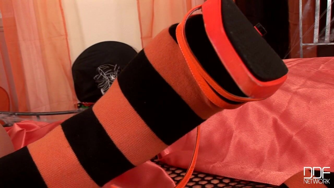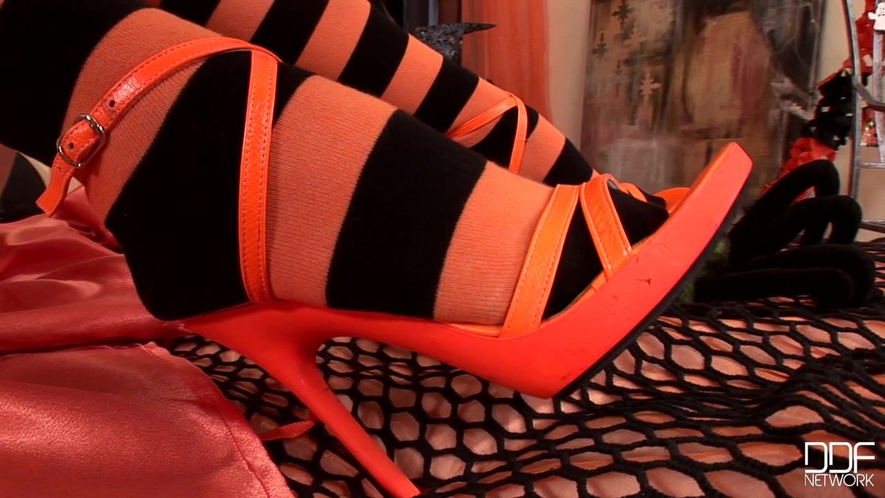See Kami in her witch hat, displaying her size seven tootsies as she gets fully into the spooky mood of spiders and ghosts and pumpkins and, most importantly from our point of view, orange and black over-the-knee socks, and orange ankle strap platform sandals. With cute toy tarantulas crawling up her legs and grinning pumpkins looking pleased as punch to be manipulated by her stocking feet, Kami is the centerpiece of a truly fun and sexy holiday performance. Of course, she doesn't get so distracted by all the insects and spirits that she forgets to peel down her panties and show us her pussy, but for our fetish purposes the sexiest shots are the ones where she dominates a pumpkin, whose orange face with its wide smile looks as if he's happy to stand in for all our faces as he gets stood on by Kami's foot. She brings the pumpkin into bed with her, where the lucky fella gets really close to her bare snatch, while she takes off her socks and crams them between her toes and thighs. Plastic spiders crawl over her insteps, and cute little ghosts dangle from her toes and nestle in the nooks of her soles, as Kami thoroughly indulges the spirit of this holiday. It all ends with some really great shots of the spider on her soles and her pretty feet posed on the floor., 10/28/2010