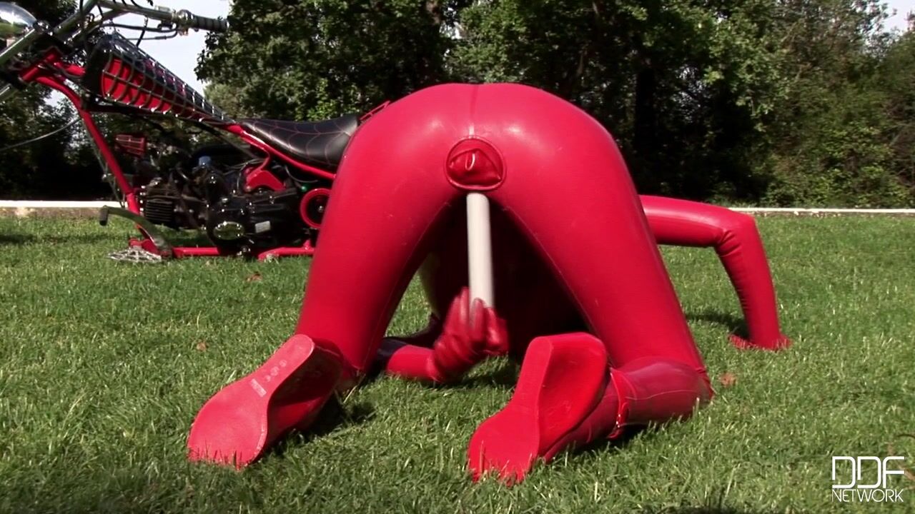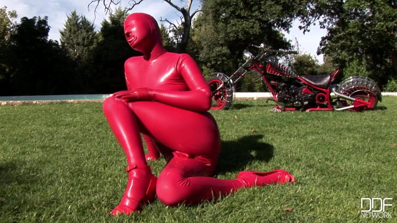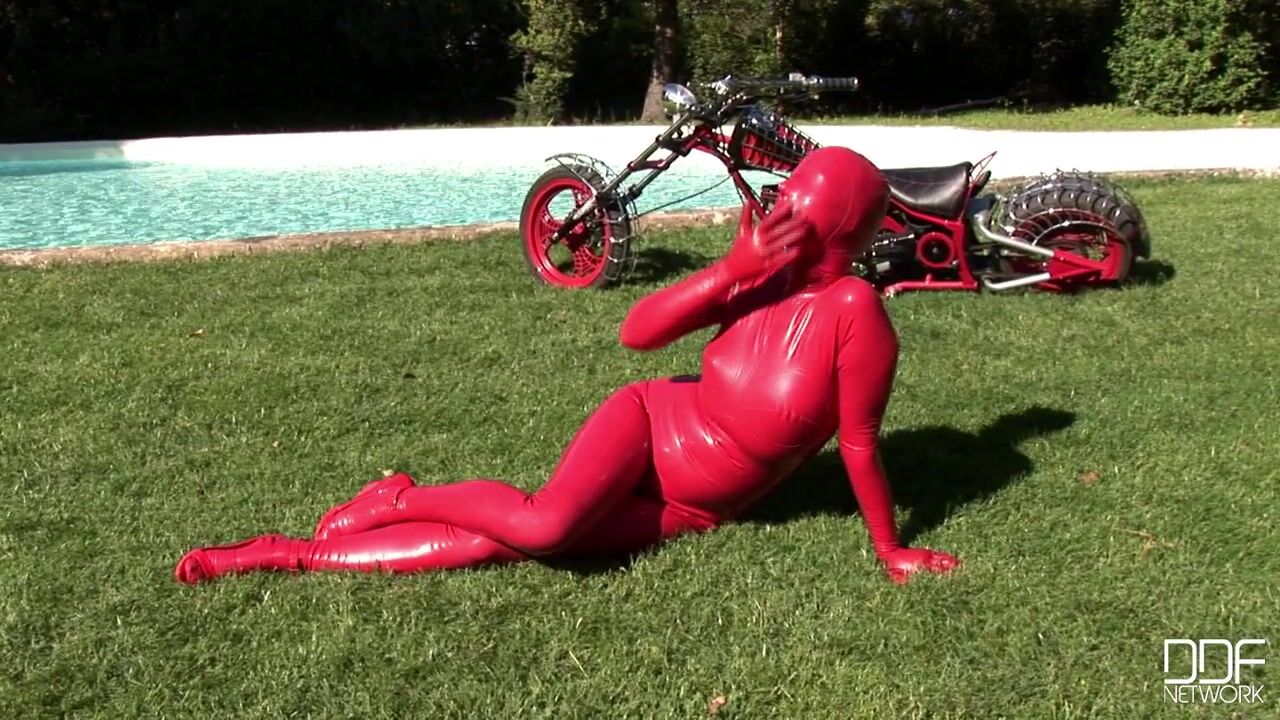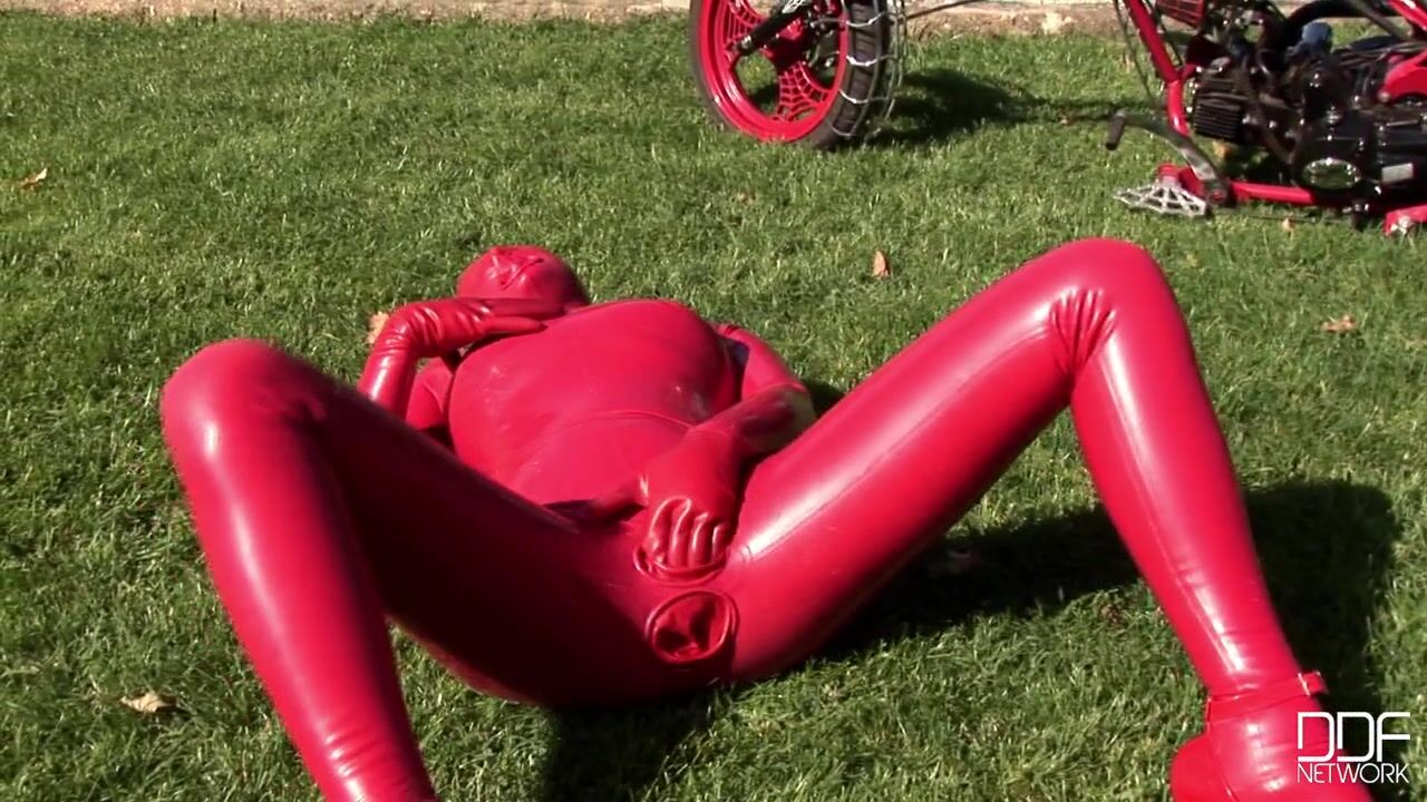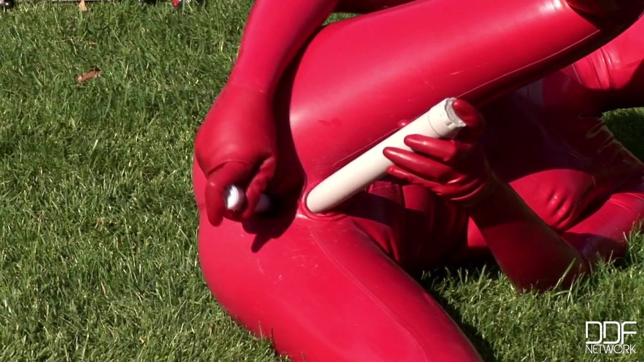 Busty & kinky Sandy got her body totally covered with some red latexwear only to go out to the garden & insert toys in her pussy & ass! The hot-blooded babe is really into latex fetish, and enjoys very much to get exposes & masturbate with her toys..., 09/27/2010