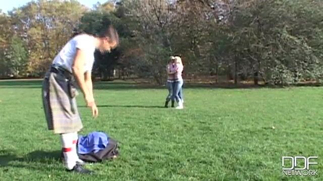 Come and see Frank show two girls how to do the Highland Fling! I think it could catch on. Little did Frank know that there were some big fans of the manly entrants to the Highland games in Dorina and Tiffany. These girls love each other, but Tiffany likes a big, hard cock once in a while and Dorina likes how wet it makes her girlfriend! So as he practiced in the park he realised that it was what was under his kilt that they were interested in and so he took them home to oblige them, and give them one more autograph on their wall., 12/02/2004