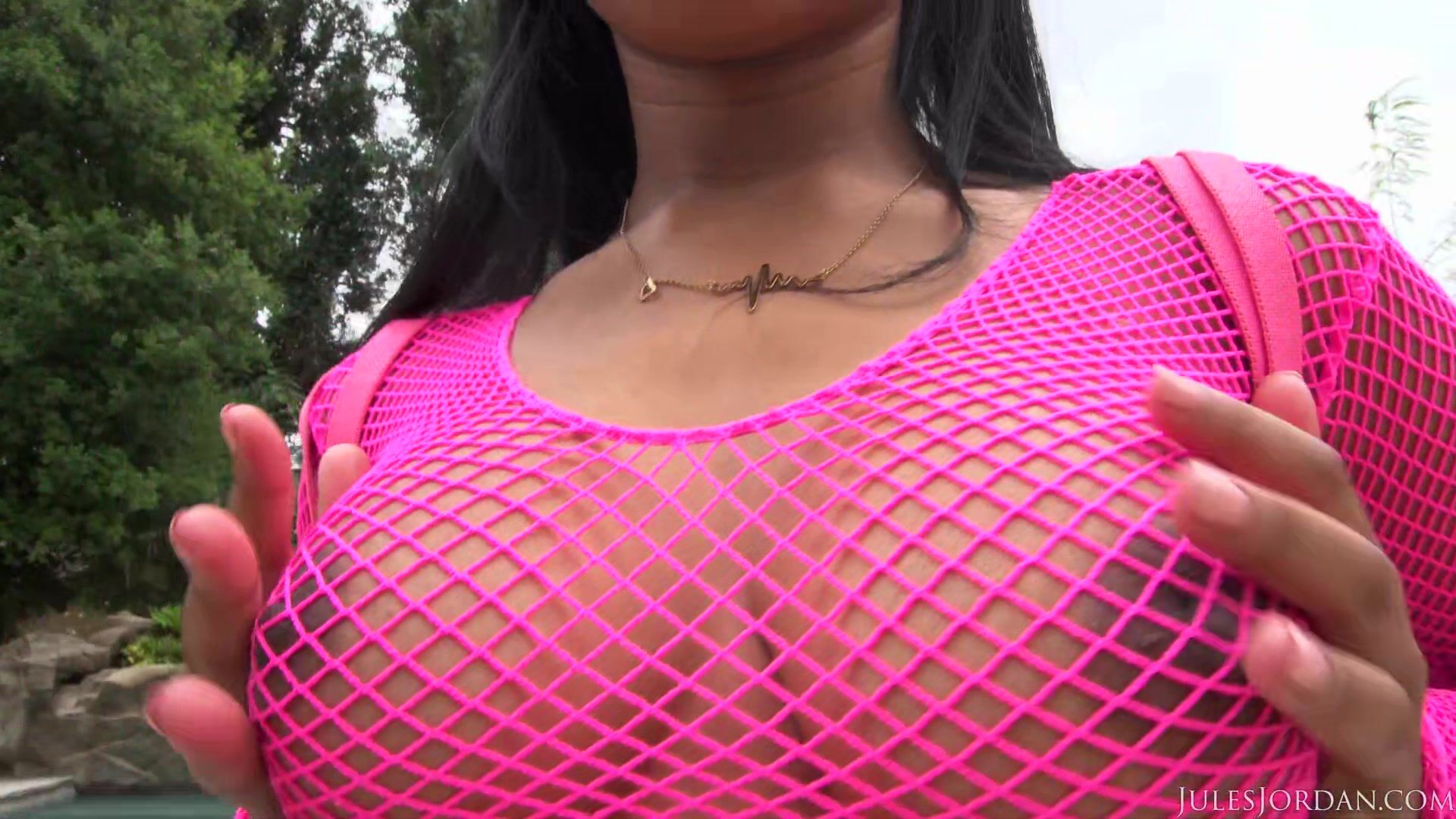 Ebony beauty Jenna Foxx makes her JJV debut with this scorching IR scene. Jenna is an all natural, Canadian born fuck toy with killer curves and an amazing rack. She's wearing a pink fishnet shirt that's doing a terrible job at covering up those perfect tits of hers, along with skin-tight leggings being held up by a tiny pair of suspenders. Jenna slowly peels her clothes off to expose her mocha skin as Manuel watches from afar. She meets Manuel inside and gets right down to business showing him her exquisite cock sucking skills. This chick knows her way around a huge cock, this definitely isn't her first rodeo. Jenna eagerly jumps on top and starts riding that cock, grinding her hips to make sure she takes the whole thing deep inside her. Then Manuel takes control and pounds her in the spoon position before making her wrap those beautiful tits around his cock for a titty fucking. He finishes her off from behind and then shoots his load all over her mouth and tits, you're not going to want to miss this one.