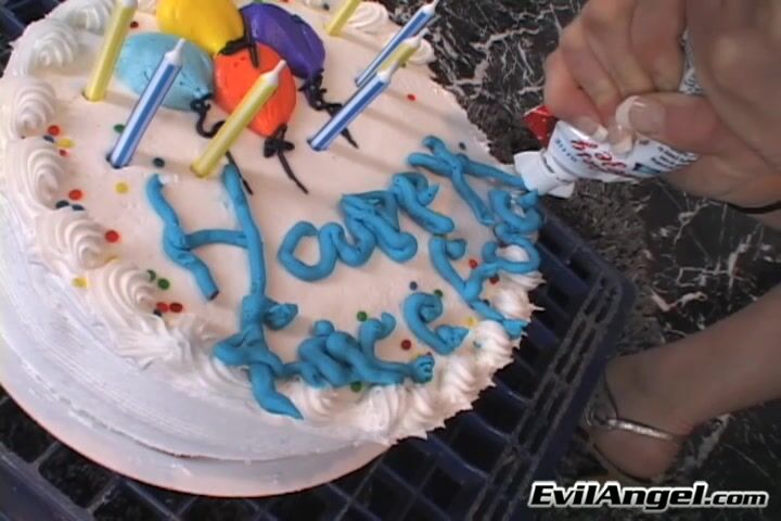 It's sexy redhead Ami Emerson's birthday, and the slender teen wants to celebrate with a good face-fucking. Wearing a party hat, the long-haired beauty gets on her knees and a quartet of horny dudes take turns using her mouth, sinking their cocks down her gullet and fucking her face while she gasps and chokes. Ami's eyes water. Next, the guys finger her cunt until Ami climaxes and ejaculates girl cum all over her birthday cake, putting out the candles! They feed her cake and icing off their dicks and ball sacks. Finally, all four gentlemen splatter her pretty face with gooey sperm.