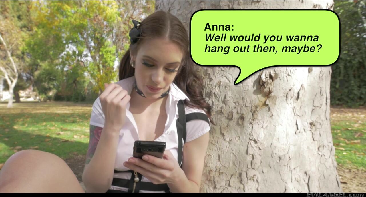 Cute college slut Anna de Ville hooks up with older guy Bryan Gozzling on a dating app, so she goes to his house for an impromptu face-to-face meeting. The stylish student is soon getting her perfect tits manhandled and her bald poon fingered to a juicy orgasm. Aggressive Bryan shoves his hard cock down the petite girl's throat. Anna takes a ferocious anal banging from her tattooed date, and she sucks dick ass-to-mouth. Her rectum is left red and gaping; her pretty face covered in spit and splooge.