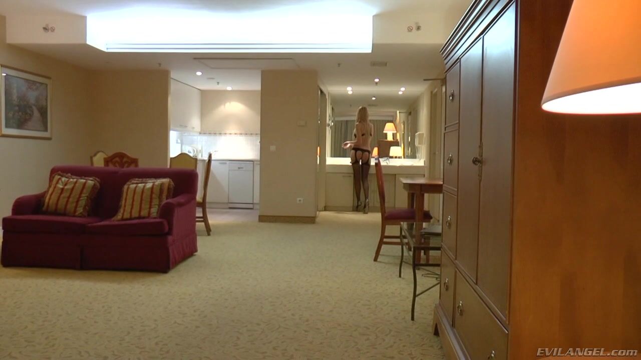 In garters, stockings and heels, tall, blonde model Karina Grand primps in the bathroom mirror. Pornographer David Perry, shooting POV-style, says she's late for her shoot, but she wants to stay in the suite and fuck him. She spreads and masturbates, tasting her pussy juice on her fingers. Karina kneels for a POV blow job, making eye contact with the camera, and David fucks her natural titties. He takes her pussy, fucking her over the bathroom counter, and Karina sucks dick pussy-to-mouth. In the bedroom, David nails the tattooed, pierced beauty anally, and she sucks his tasty meat ass-to-mouth. More anal pounding on the bed is captured from a 'voyeur's eye view.' Satisfied Karina strokes his semen into her mouth.