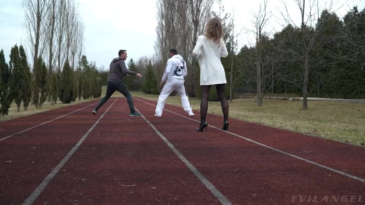 European cutie-pie Jayla De Angelis likes what she sees as trainer Kai Bailey and championship boxer Maximo Garcia spar in the gym. She tells the sweaty, cut studs, 'When you guys fight, it turns me on.' The brunette strips down to lingerie and sucks their big cocks. Kai invades her pussy while she strokes Maximo's rod. Maximo spreads Jayla's hose-encased gams and dips into her sweet cooze. Her natural tits jiggle as he fucks her. Maximo delivers a spoon-position anal reaming, and then Kai stuffs his meat in her bunghole. In a heavy double penetration, she takes Kai's cock in her cunt as Maximo rams her rectum! They switch roles -- Kai's dick rails Jayla's ass as she gives Maximo an ass-to-mouth blowjob. Jayla's asshole gapes widely! The two gladiators lift the little lady from the floor to further stuff her cunt. She opens her mouth for a cum facial and then swallows sperm. If you can't beat 'em, lick 'em!