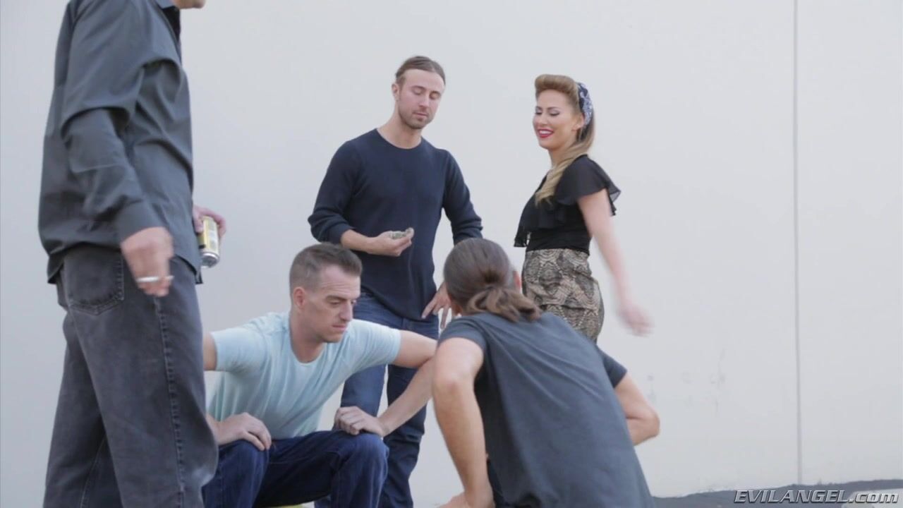 Blonde beauty Carter Cruise, elegantly puffing a cigarette in pearls, painted red lips and a 1940s 'do, recruits a quartet of rough neck working stiffs to defile her in a circle suck. Aggressively she sways her ass in a thong, telling the dudes to stroke their dicks. Chad Diamond, Filthy Rich, Chad Alva and Eric John surround her, cock-slapping her gorgeous face. Stroking, sucking and spitting on four big boners trashes her refined make-up. Carter deep-throats and laps balls. The lucky bastards get rough, choking her and stuffing her mouth with multiple pricks at once. 'Finish me off!' she bellows as Chad eats her hairy bush, and it's orgasms all around. Face bathed in cum, a suddenly sober Carter barks, 'You guys need to get the fuck out.'