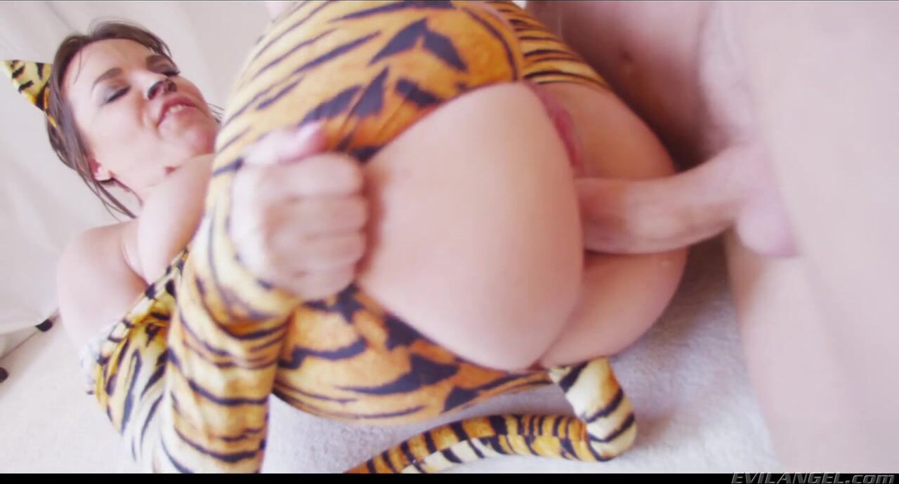 Wearing a sexy tiger costume, slender Dana DeArmond drools on her natural titties and meows with glee as she strokes her pussy. Animal lover Mark Wood offers this sexy feline a taste of his giant dick, and Dana drools and gurgles as she gags on his throbbing shaft. Mark fucks the purring jungle cat, ruthlessly sodomizes her sweet butthole until it gapes, and lets his naughty pet suck his hard cock ass-to-mouth. Finally he gives Dana a gooey sperm facial.