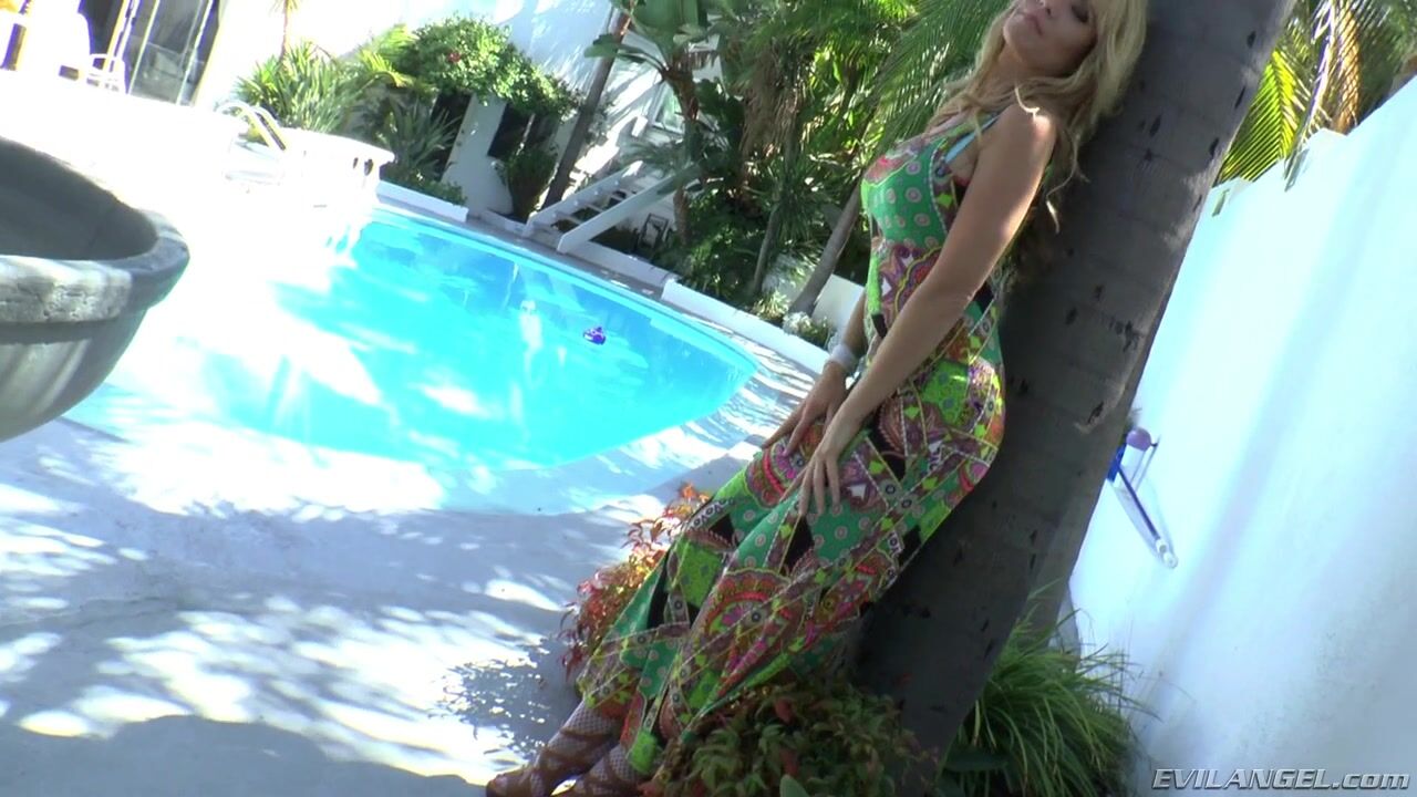 Blonde, blue-eyed MILF Desi Dalton, a 46-year-old busty beauty, poses by the pool in a long dress that shows her hot cleavage. Watching her, young, hung stud Jessy Jones strokes his big cock hard, so Desi strips down to her lingerie and shows him the stripper pole moves she's learning. She blows and strokes his thick prick and tugs his balls as they kiss. Jessy plows her shaved snatch doggie-style and Desi sucks dick pussy-to-mouth. A skin-slapping fuck with a vibrator applied to her clit makes her whimper. She stuffs one vibe up her box and works her clit with another. As the toys buzz away, Jessy cums on Desi's pretty face. She orally cleans cock and vibrator.