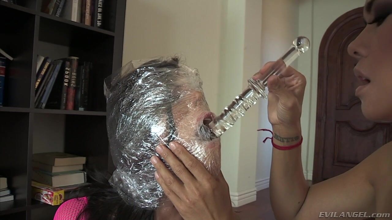 Fishnet-clad and rope-bound, brunette slave Adriana Chechik keeps annoying Mistress Dana Vespoli with her ceaseless whimpering. Dana decides to shut her up with some intense lesbian domination! She shoves her fingers down Adriana's throat, licks the spit from her face, wraps the gorgeous girl's head in plastic and applies clothespins to her outstretched tongue. Then Dana invades Adriana's throat with dildos, expands her asshole using a metal speculum, and vibrates her to climax.