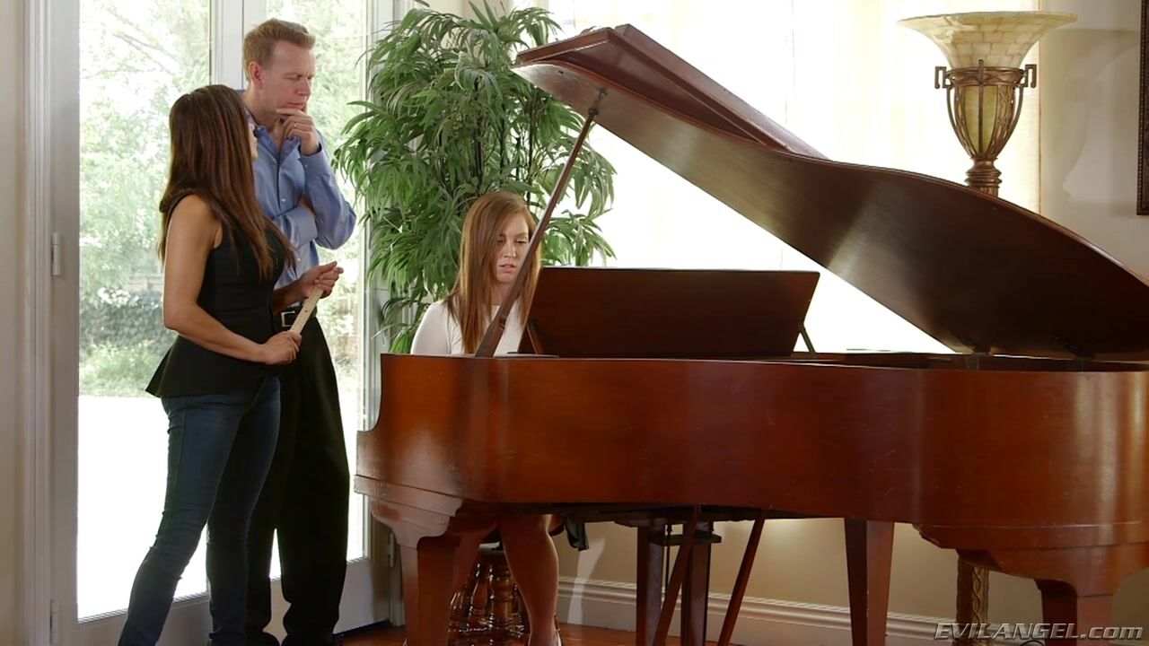 Piano student Maddy O'Reilly (the cute redhead next-door in a skirt and sweater that shows off her curves) is ill prepared for a recital, so instructors Francesca Le (the American Latina MILF beauty) and Mark Wood (the hung stud) provide rough discipline. As Mark's thick dick works her mouth, pussy and asshole, Francesca works Maddy over with a mad variety of face/tit slapping/mashing, spanking, ruler smacking (hand, ass and face), hair pulling, facial spitting and face sitting. Francesca thrashes Maddy's face, tits and mouth with feet, stuffs panties in her mouth. Face fucking generates gag spit, tears and wrecked make-up. Mark spanks her ass red. Maddy sucks dick flavored with pussy and asshole. Francesca sticks a butt plug up Maddy's bunghole, smears her face with asshole and stretches her lips for a cum plastering.
