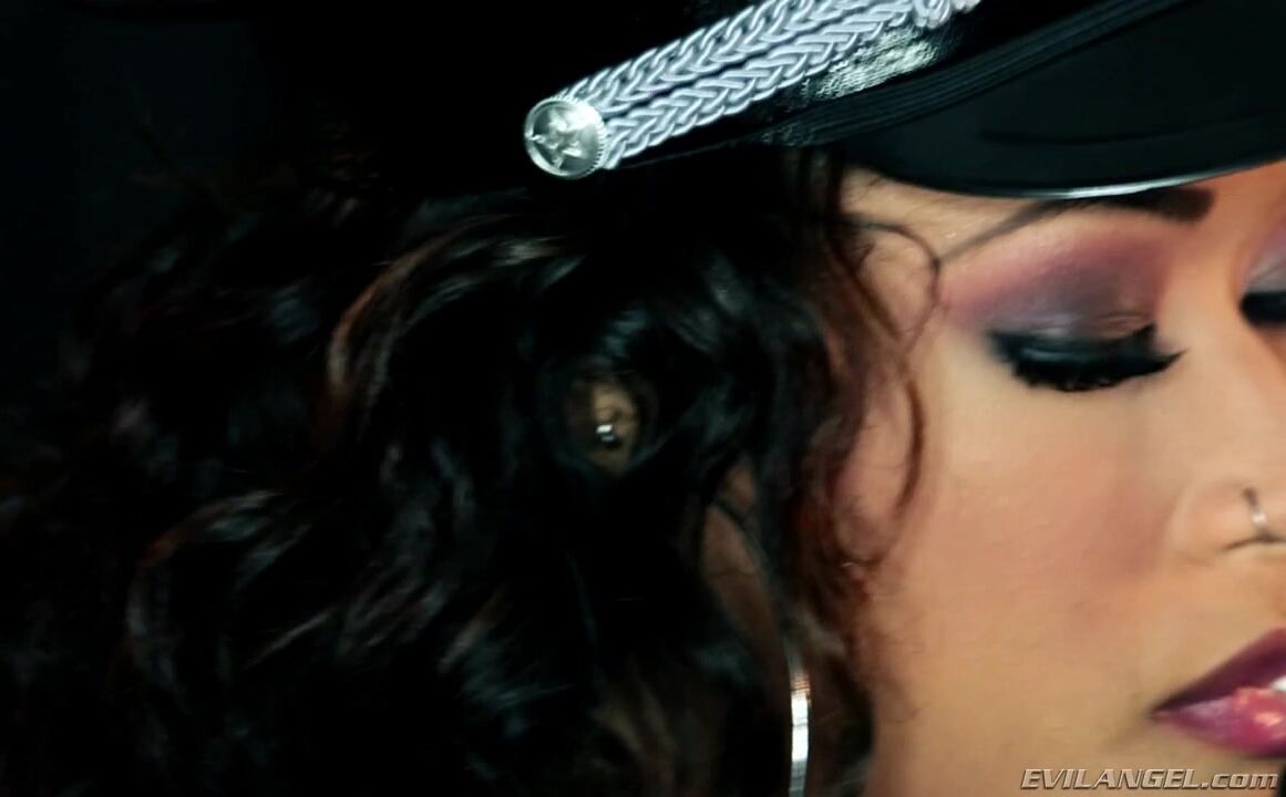 In a studded bikini and wicked leather boots, kinky Nubian street slut Skin Diamond smokes a cigarette, and leather-clad white rocker Xander Corvus hits on her. First she gives him attitude, but when Xander plays her his band's tunes, Skin likes what she hears; the stunning punkette drops to her knees and swallows his fat shaft right there on the sidewalk. She leads him indoors and bends over, offering her young snatch for a serious pussy pounding. This sexy, tattooed brat gets her throat and juicy cunt rammed with throbbing meat. Eventually, Xander fills Skin's pretty mouth with hot spunk.